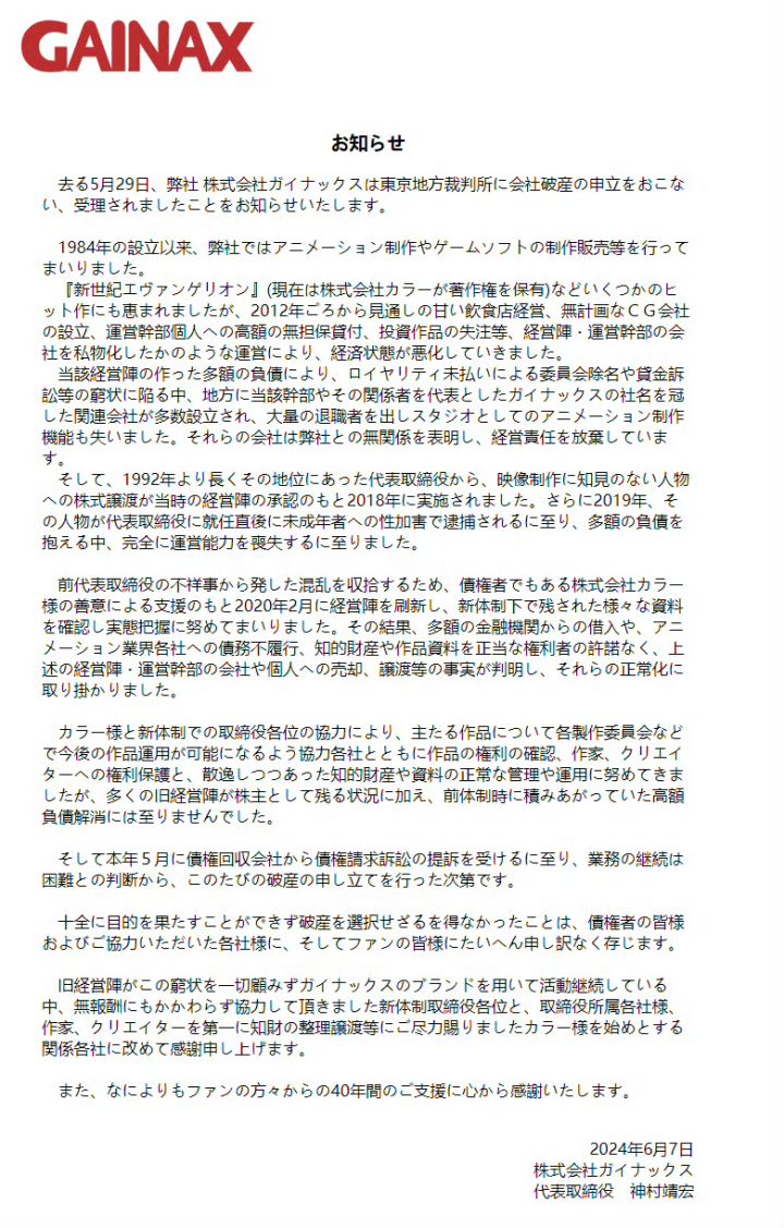 《新世纪福音战士》动画制作公司GAINAX因为经营不善及债务等原因,正式宣布破产。 该公司于1984年成立,代表作:《新世纪福音战士》等动画;《美少女梦工场》系列游戏。破产后旗下商标将转让给株式会社Khara管理。个人拙见:其社长估计要背一半的锅,私德不行,影响公司声誉。当然,经营不善也是另一方面#今天游戏圈发生了啥 #游戏资讯