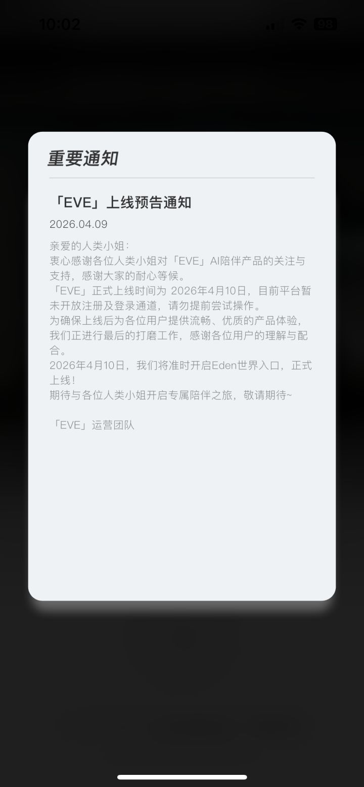 「EVE」将于4月10日正式上线!在上线前的最后检查中,我们发现仍有部分问题需要继续优化。为了不影响大家的首次体验,我们选择再做一些完善,上线时间将在今日确认后第一时间公布。上线后将为注册用户准备一份特别的新人礼,也很期待能尽快和大家见面。为了迎接各位人类小姐,Eden世界在做最后的打扫啦~感谢大家的支持与耐心等待!#EVE