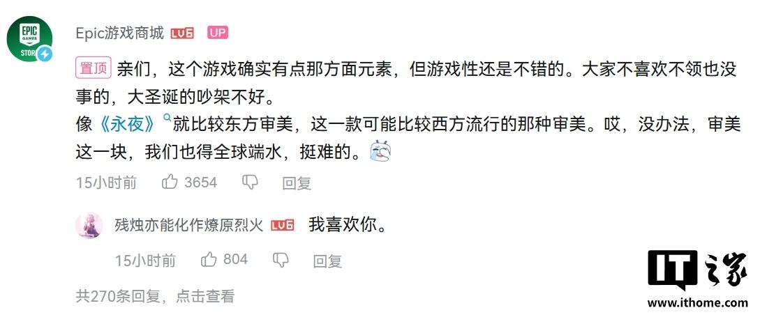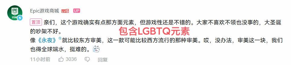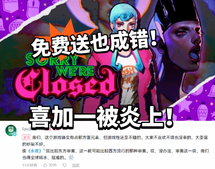 12月22号,Epic送的游戏是包含了LGBTQ元素的《抱歉我们打烊了》,为平息评论区的争议不得不卑微劝架。“亲们,这个游戏确实有点那方面元素,但游戏性还是不错的。大家不喜欢不领也没事的,大圣诞的吵架不好。像《永夜》就比较东方审美,这一款可能比较西方流行的那种审美。哎,没办法,审美这一块,我们也得全球端水,挺难的。”早在上周,Epic就提前“跪地