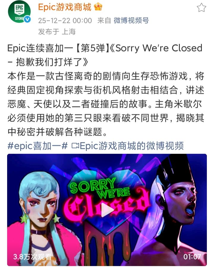 Epic游戏商店公布本周神秘免费游戏为生存恐怖作品《对不起我们关门了》,此为假日促销活动的第五款作品。游戏于北京时间12月22日0:00起免费领取,24小时后将被新神秘游戏替换。此次促销计划共赠送17款游戏,持续至明年1月初。《对不起我们关门了》是一款融合经典设计与现代元素的单人生存恐怖游戏。采用固定摄像机视角与第一人称恶魔武器战斗结合的系统,玩家需在伦敦街区探索诡异环境、管理资源并解谜。剧情围