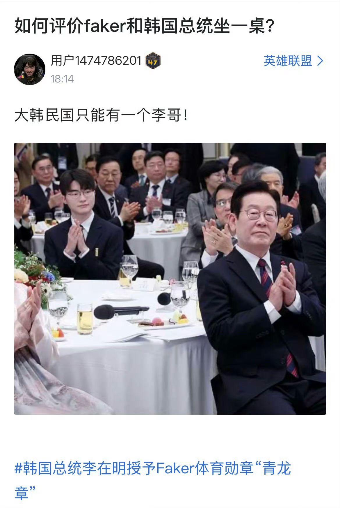 1月2号,Faker被请到青瓦台参加新年招待晚宴,坐他对面的是韩国总统李在明和第一夫人。 同桌都是总理啊、议长啊这些,规格相当高创下电竞选手纪录。吃饭前,总统还亲自给Faker颁了“青龙章”, 这个奖是韩国体育界的最高荣誉,以前拿这个的都是孙兴慜、金妍儿这种国宝级运动员。 Faker是第一个拿到这个勋章的电竞选手,他拿了6次世界冠军、10次联赛冠军,还有亚运金牌等80多项荣誉,出道12年一点