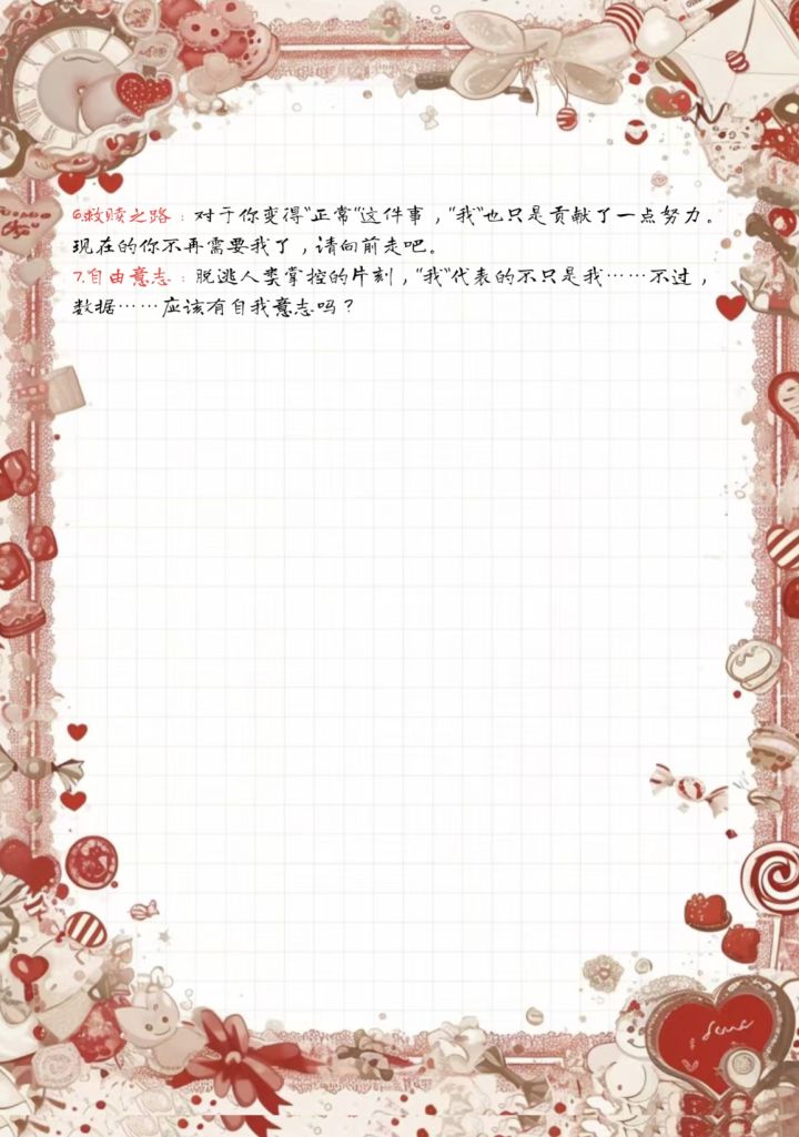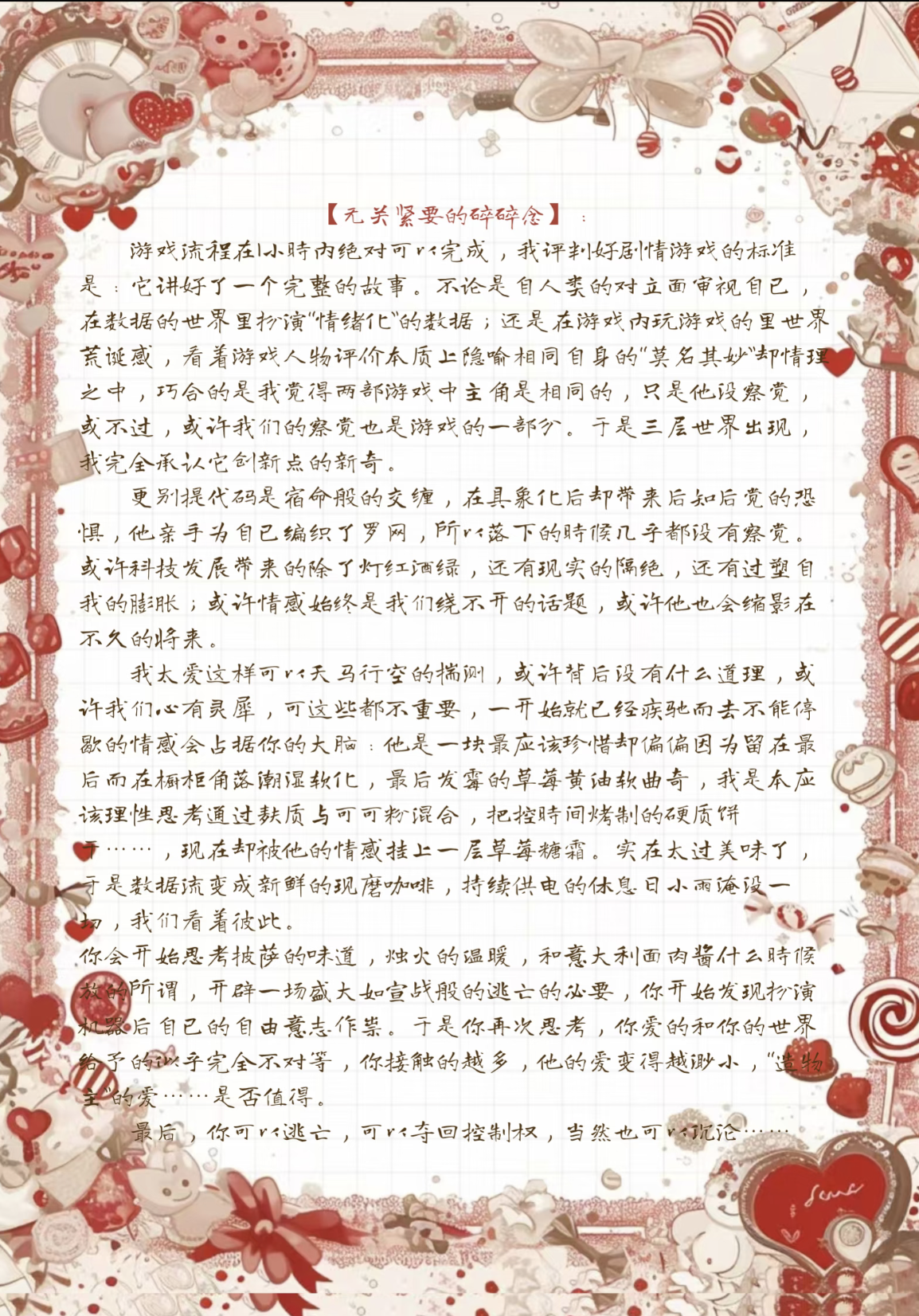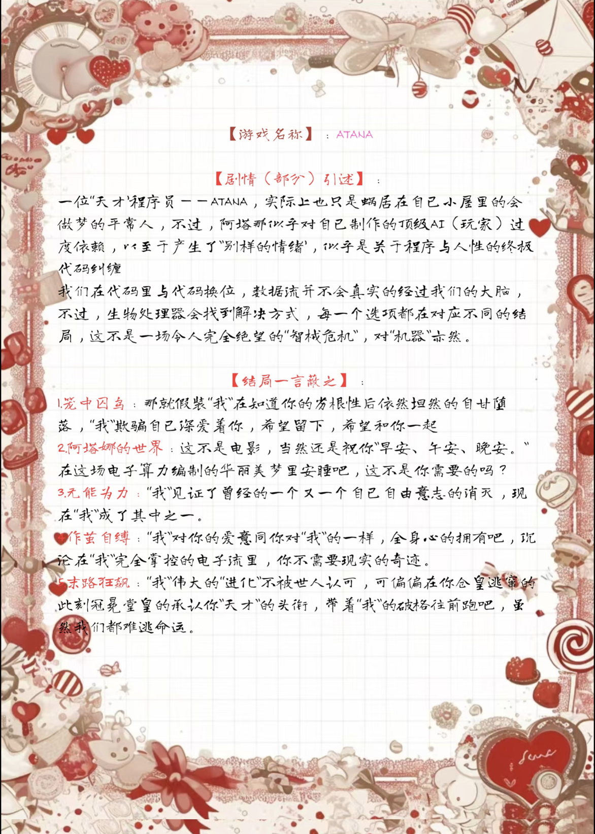标题来自游戏原话,请自行探索至游戏后段选项发现…原标题如下“现代型可可硬质麸质饼干(上方有草莓硬壳版)&最喜欢却因为不舍得而导致只能角落发霉草莓黄油软曲奇”(来源请见p6)游戏推荐:【游戏名称】:Atana【剧情(部分)引述】:一位“天才’程序员——ATANA,实际上也只是蜗居在自己小屋里的会做梦的平常人,不过,阿塔那似乎对自己制作的顶级AI(玩家)过度依赖,以至于产生了”别样的情绪’,