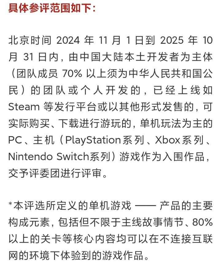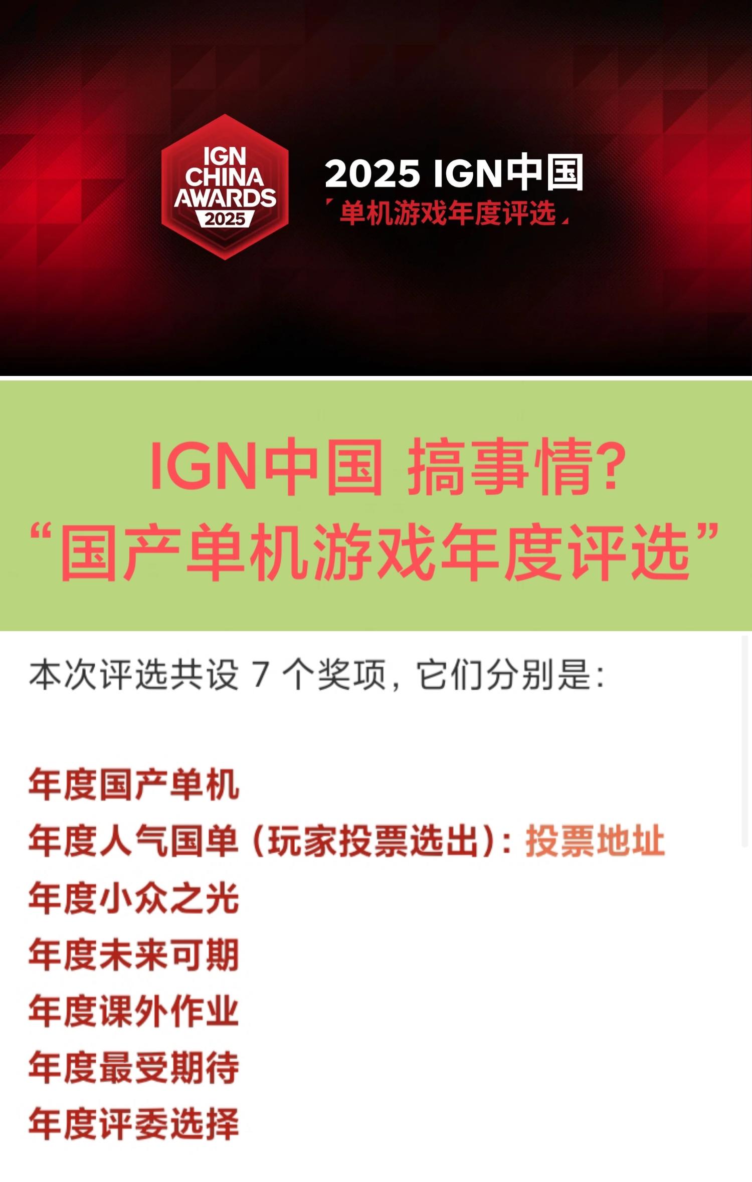 1月5号,IGN中国团队发文,声称要搞“2025 IGN中国单机游戏年度评选”活动❗❗❗这是一次由IGN中国编辑团队发起,以过去近一年间,由国产团队开发并上线的优秀单机游戏产品为对象举办的“表彰”活动。🎉🎉🎉所谓国产,即游戏团队成员70%以上须为国人。所谓单机游戏,8成以上的内容不联网就能玩的游戏。本次评选共设7个奖项,分别是:1.年度国产单机2.年度人气国单3.年度小众之光4.年