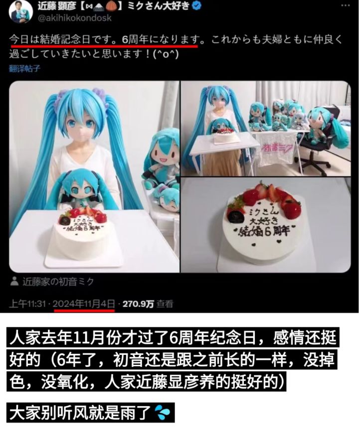 哎呀,真是的,最近这些营销号真是够可以的,竟然拿初音未来的事情来炒作(机车)。说什么“初音未来婚内遭遇不幸”,这不是纯属胡编乱造吗?OK我们回忆一下,2018年,那位35岁的日本公务员近藤显彦,为了追求心中的爱,不惜砸下重金买下初音未来的临时形象版权,还举办了一场别开生面的婚礼,当时可是引起了不小的轰动。后面这个版权到期了。不过,那之后这个话题在国内也就逐渐淡出了人们的视线。可是,最近这些营