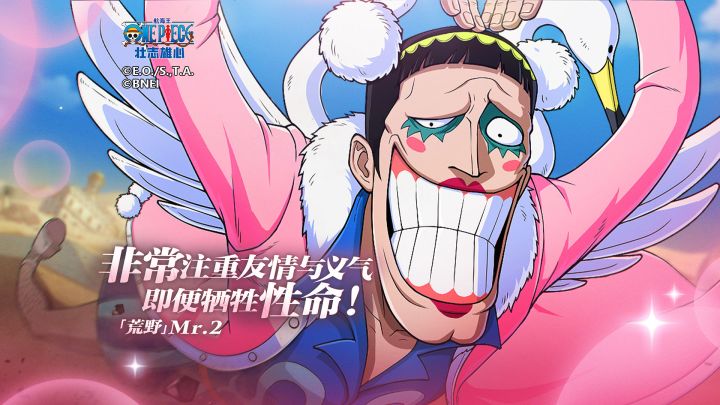 用变身传递正义与无畏的心, 神秘莫测的戏法高手, “荒野”Mr.2登场! 「凋零吧 一同在这片真诚的苍穹之下」 「绽放吧 人妖之道」 戏法之中蕴藏正义,变幻之中展现光芒! 伙伴获取途径:#航海王壮志雄心 正式上线后,参与【Mr.2的友情羁绊】完成任务,获取羁绊值即可免费获得! ——欢迎船长登船—— >>>预约通道:https://www.taptap.cn/app/656788 #航海