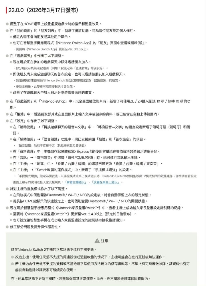 今天,任天堂面向Switch 2主机推送22.0.0版本系统更新,新增好友备注与掌上模式增强功能,同时优化系统整体稳定性。 本次更新核心为掌上模式增强功能,开启后主机在掌上与桌面模式下,可让Switch游戏以TV模式同等性能运行,提升画面表现,同时会增加电量消耗。功能实际效果随软件不同存在差异,Switch 2专用游戏及部分初代Switch游戏不支持该功能。开启该功能后,主机将无法使用触摸屏,