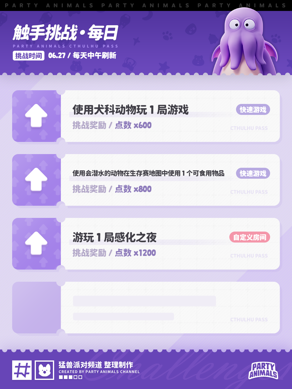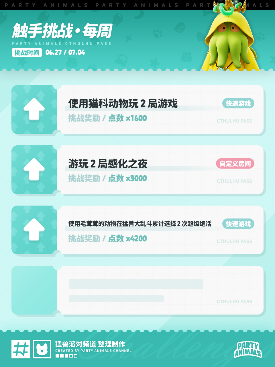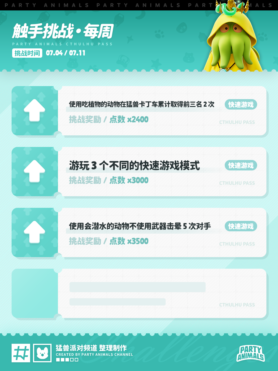 完成每周挑战,获取大量经验和饼干 【快速游戏】组队完成 5 局游戏 奖励:猛兽经验 x1000 【快速游戏】使用会潜水的动物在生存赛地图中累计击打对手 60 次 奖励:猛兽经验 x2000 【快速游戏】在生存赛中使用会飞的动物累计获胜 10 回合 奖励:猛兽经验 x3000 【快速游戏】使用会飞的动物玩 3 局生存赛 奖励:饼干 x3000 #猛兽派对 #动物派对 #partyanimals#Partyanimals