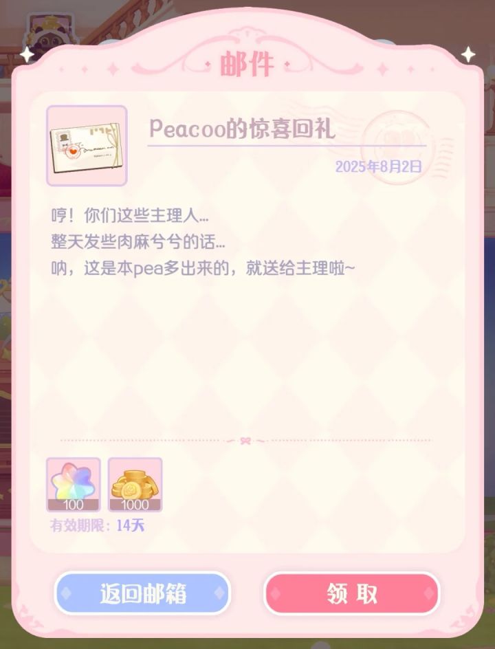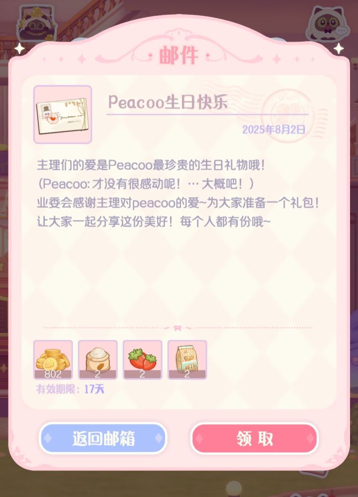兑换码:peacoo生日快乐『含802金币 2大米 2水果 2坚果』兑换码:peacoo的惊喜回礼『含星光100+金币1000,兑换有效期至8月15日 23:59』#花花与幕间剧 #花花与幕间剧攻略 #peacoo #兑换码 #花花与幕间剧兑换码 #Peacoo2025生日快乐