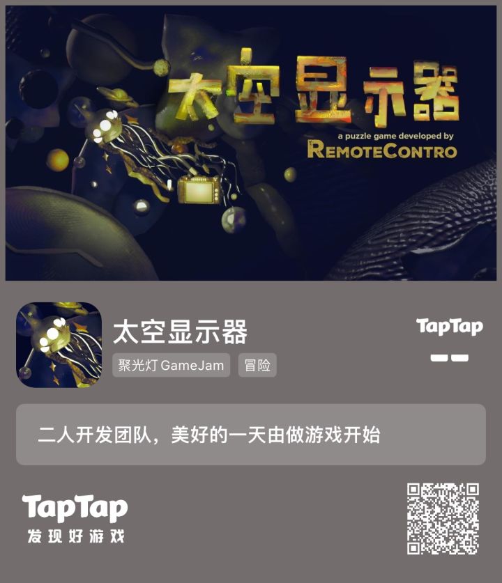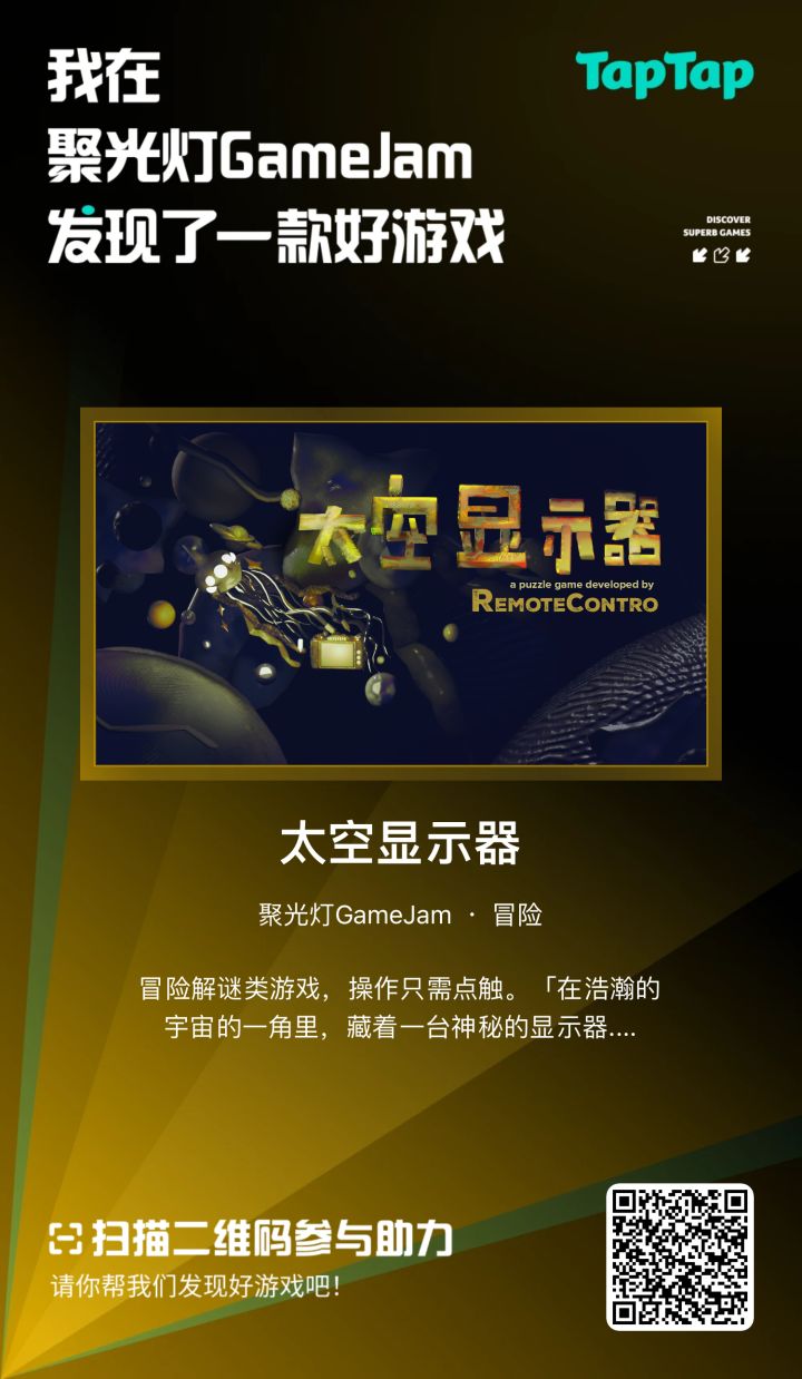 非常感谢!!逐渐有更多的人关注到了「太空显示器」为了方便大家提意见和讨论,建了群:929224739 (后续会在群里更新更多开发心得也欢迎大家把P2转发给更多朋友试玩!#TapTap聚光灯游戏创作挑战 #remotecontrol #开发日志 #独立游戏 #聚光灯游戏创作挑战 #TapTap聚光灯 #聚光灯gamejam开发者日志 #游戏日常