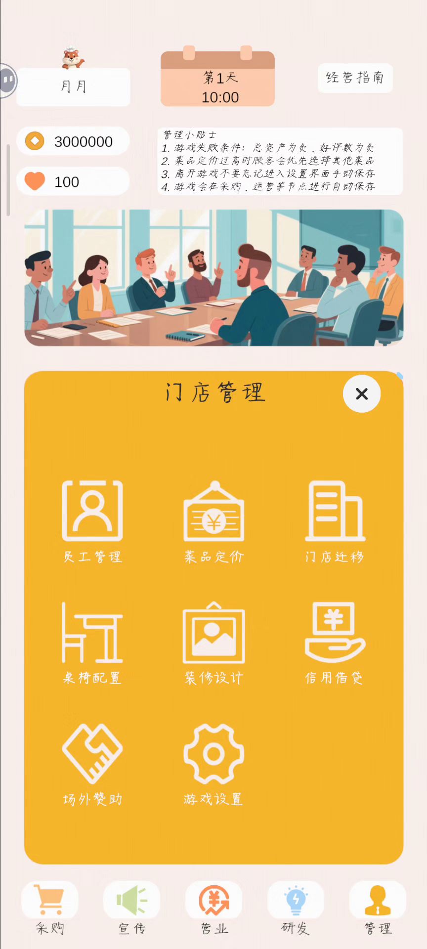 游戏10分钟,十天,营业额≈全部成本,通关速推 ①开局贷款三百万 ②菜品定价价格售卖最高五倍倍利润, ③员工4,8,8,10 ④购买60万的店铺 ⑤桌子30,19,19 ⑥折扣除了最后一个100万宣传不点,其他全点(95折,300减100) ⑦菜品推荐买就行 剩下看一下营业额,营业额约等于成本之后, 留十万, 剩下全部梭哈装饰品 #spacebar