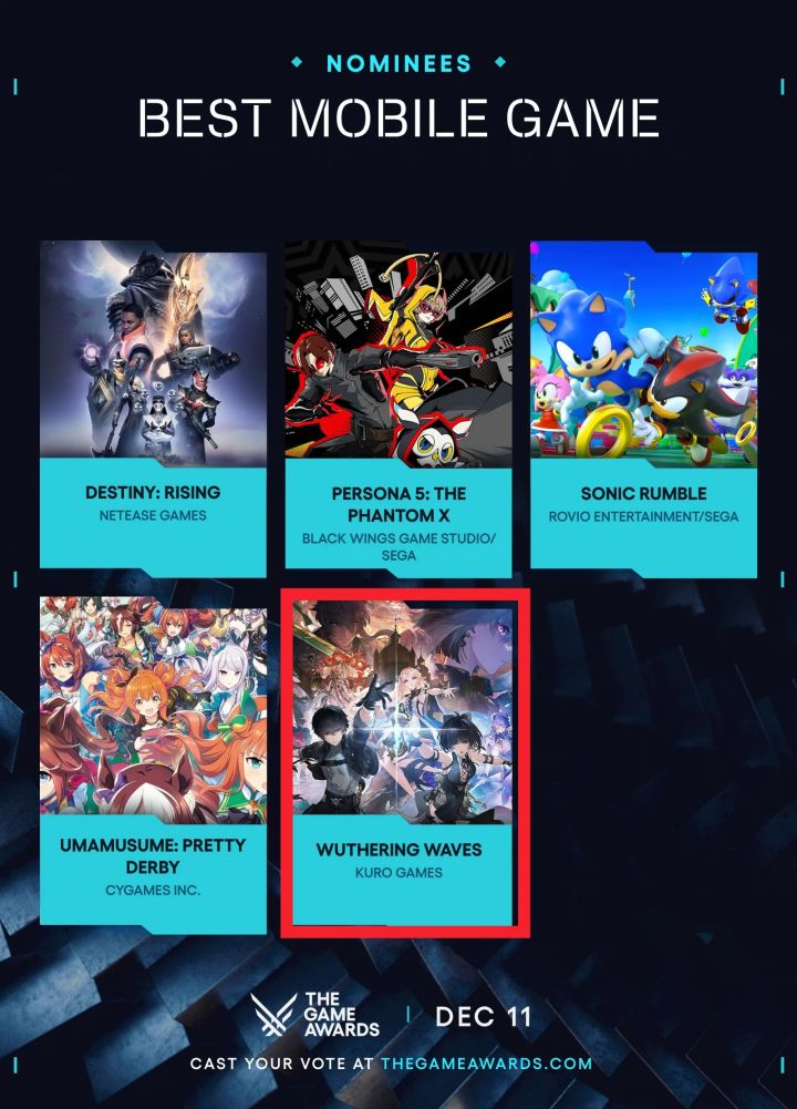 2025年TGA游戏大奖公布最佳手游提名名单出了,这波也是各家玩家各家与有荣焉~其中被提名的手游包括《命运:群星》《女神异闻录5:夜幕魅影》《索尼克大乱斗》《赛马娘》与《鸣潮》。2024年5月正式公测的《鸣潮》已经是第二次入围了,去年《鸣潮》获得提名后向全服发放了1000星声福利,虽然最后没获得奖项,也向全服玩家追加了800星声补偿。这次再度入围,好些漂泊者都在猜测不知道还会不会送