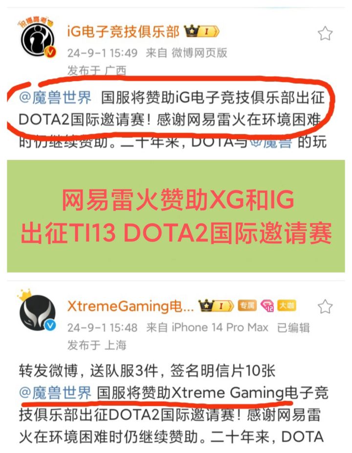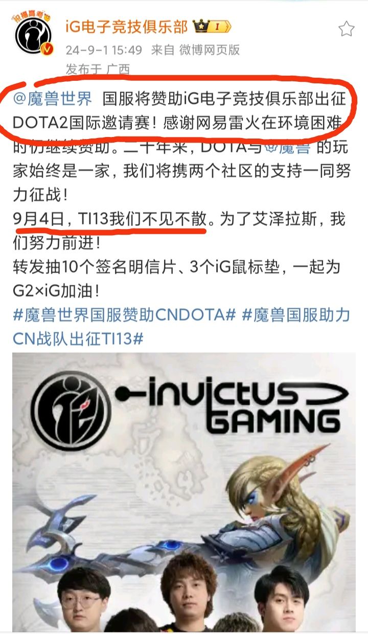 9/1号,XG和iG 两个电子竞技俱乐部同时宣布,《魔兽世界》国服将赞助出征他们TI13 DOTA2国际邀请赛❗❗❗网易雷火的赞助是好事!可惜的是,今年TI13游戏内是不允许显示赞助商和广告的,血亏现在就只有一个问题,今年中国出征TI13的有3只队伍呀!剩下那个TEAM ZERO不赞助吗,这不太好吧