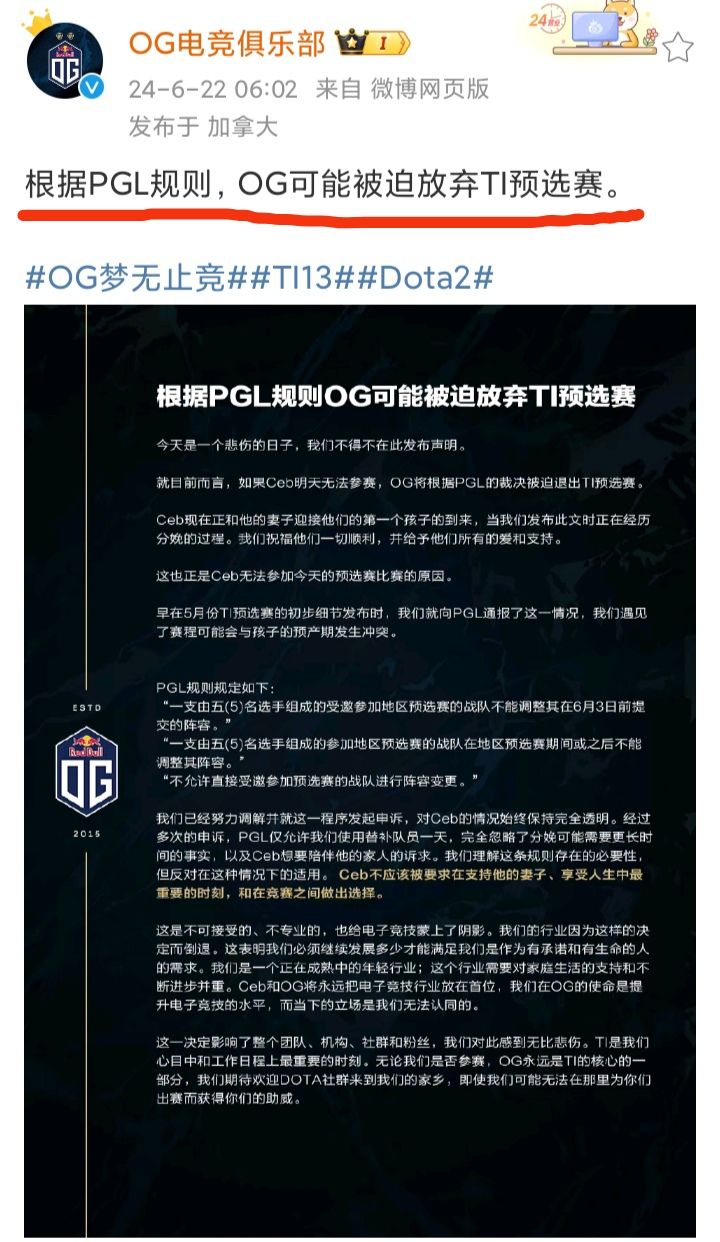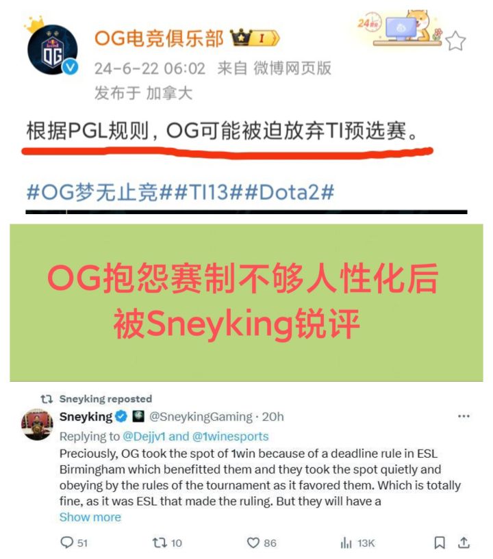 昨天6/22,Sneyking锐评了“OG抱怨TI预选赛制不够人性化”❗❗❗起因是,OG多平台发文抱怨PGL规则不人性化,因为它的队员Ceb要陪产,打不了TI预选赛某些场次!于是,写了小作文抱怨Sneyking锐评OG称:当规则对OG有利时,他们就呼吁人们要遵守规则,而当规则对OG不利时他们就开始抗议。OG不