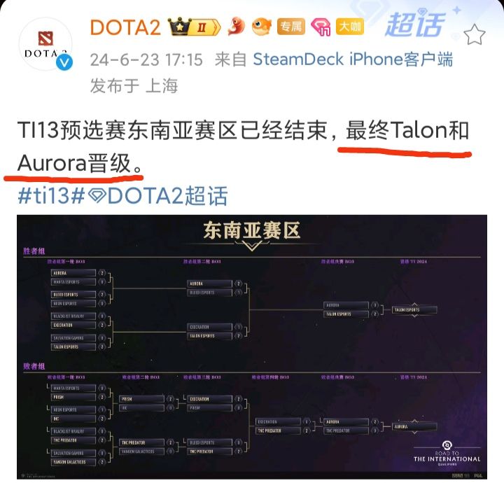 今天,DOTA2官方微博发文称:TI13预选赛东南亚赛区已经结束,最终Talon和Aurora晋级❗❗❗Aurora能晋级倒是意料之外了,因为在最近DOTA2梦幻联赛S23上,它第一轮就被淘汰了而Talon更是连今年四月份的“ESL伯明翰”都没参加,更别说梦幻联赛S23不知道大家怎么看?#今天