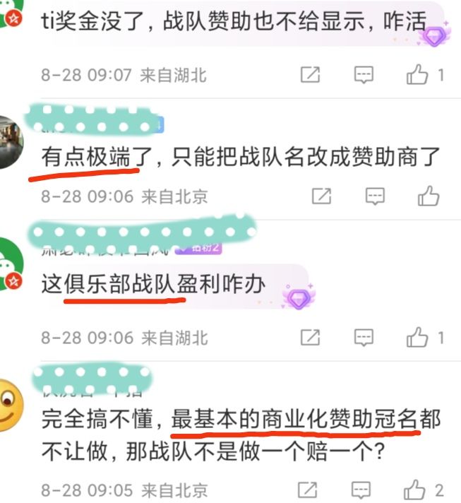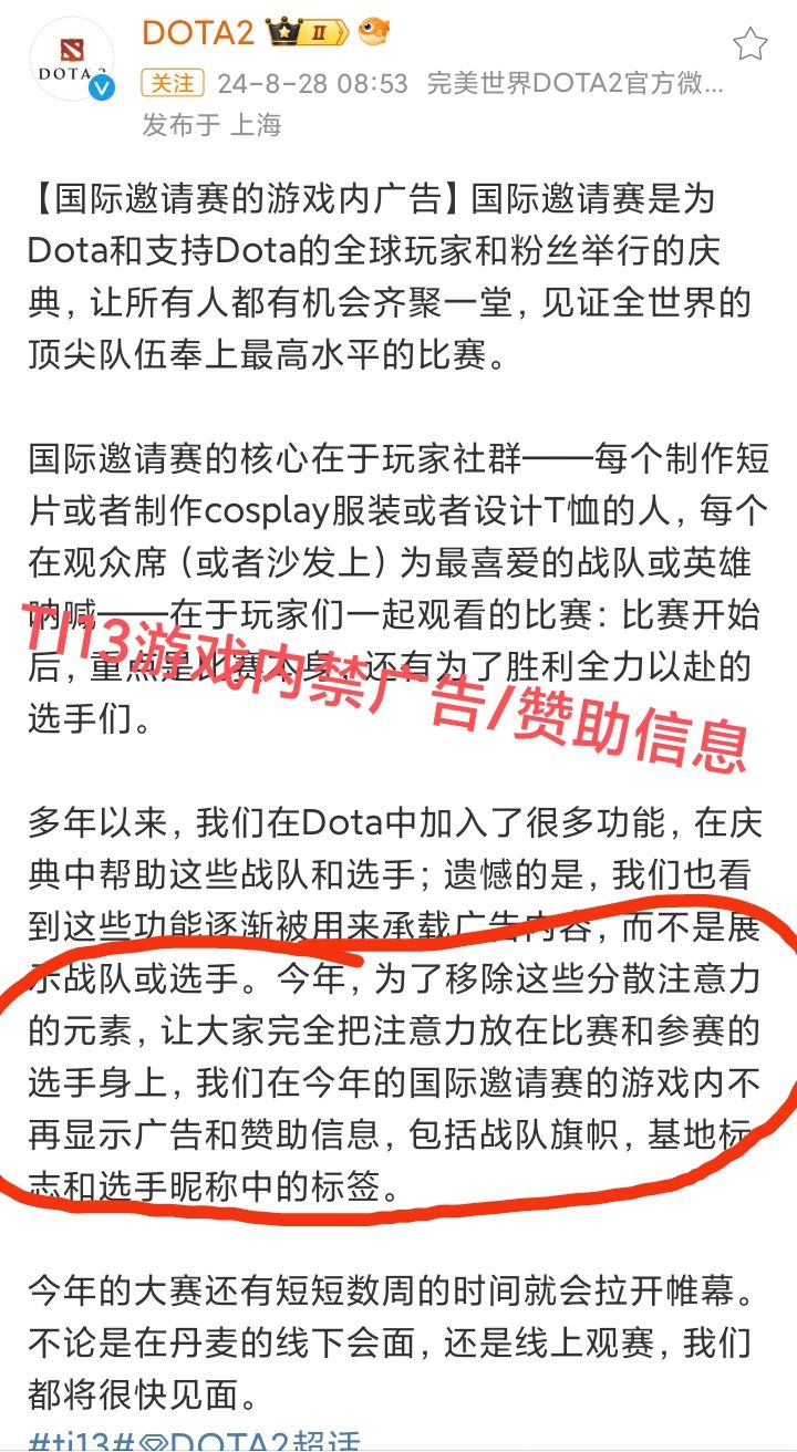 8/28号,DOTA2官方发文宣布,今年TI13国际邀请赛的游戏内,不再显示广告和赞助信息❗❗❗V社给出的理由是,为了让观众把注意力放在比赛和参赛的选手身上!所有的广告、赞助商、战队旗帜和选手昵称中的标签,都不再显示V社这一刀切,真的太狠了虽然能把菠菜广告禁了,但是正常的赞助商广告也禁,战队更没活
