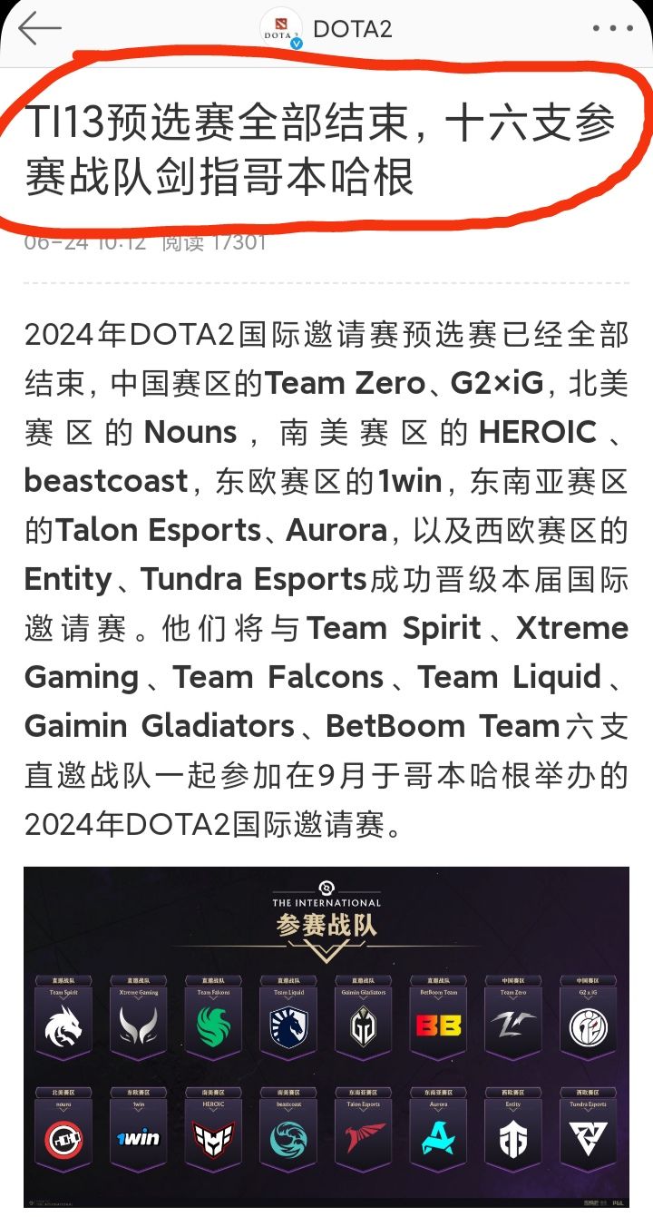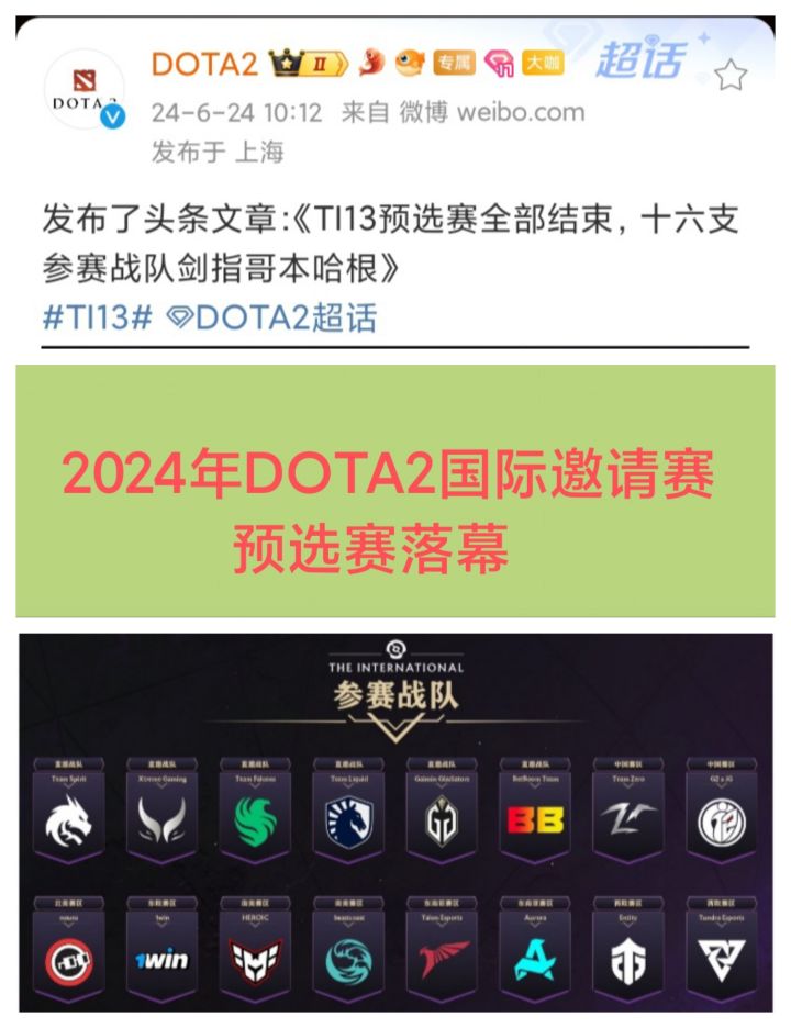 今天6/24上午,DOTA2官博发文:2024年度TI13预选赛已经全部结束❗❗❗Team Zero、G2×iG,Nouns,HEROIC、beastcoast,1win,Talon Esports、Aurora,Entity、Tundra Esports,在预选赛出线拿到TI13门票将与Team Spirit、Xtreme Gaming、Team#DOTA2