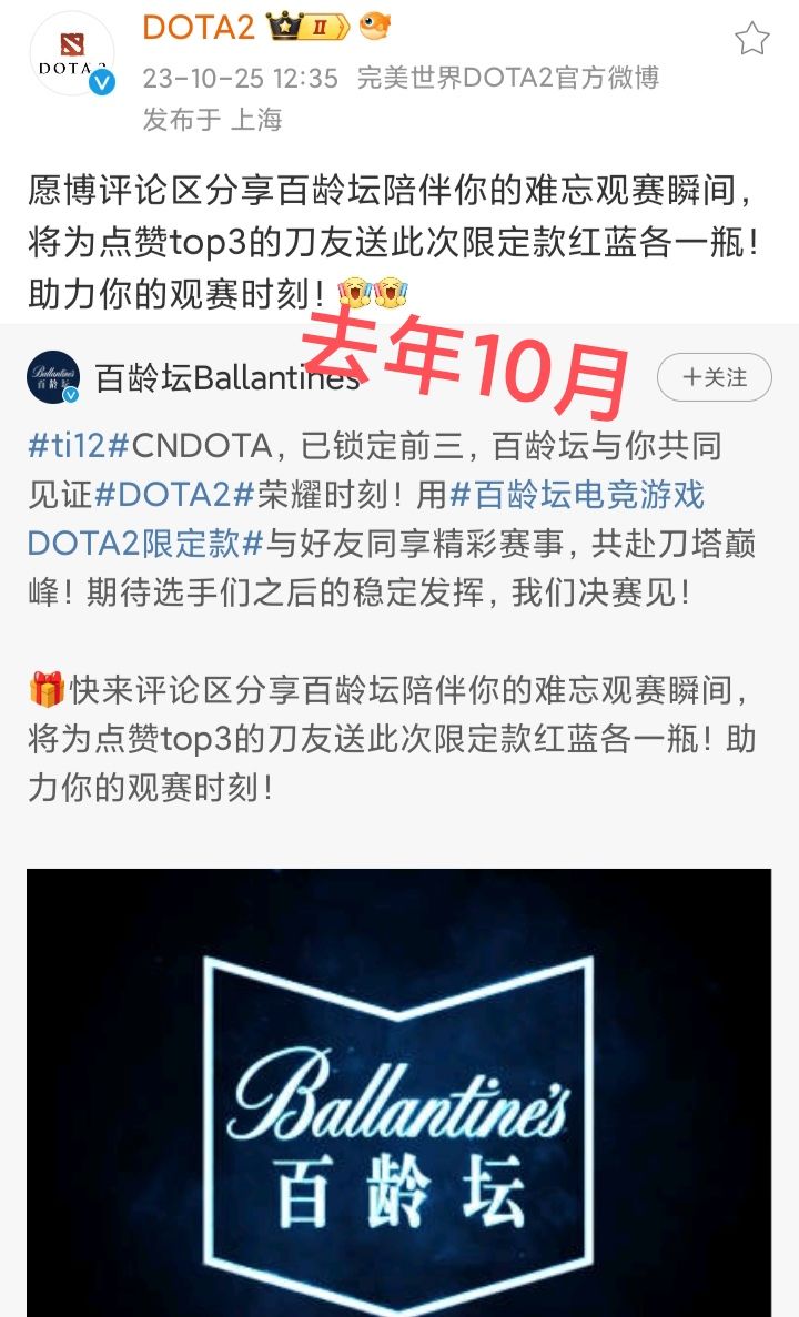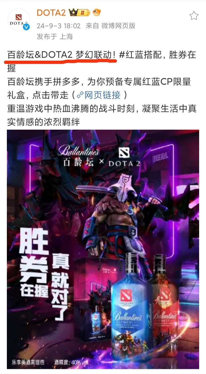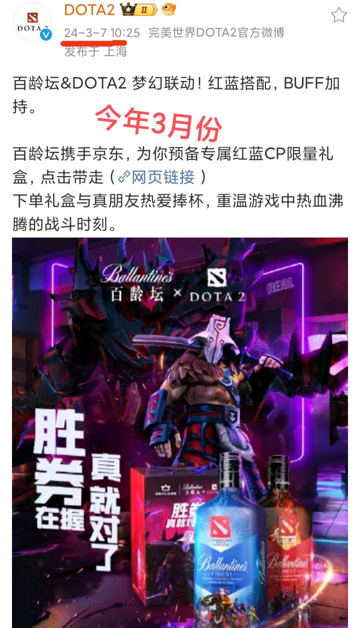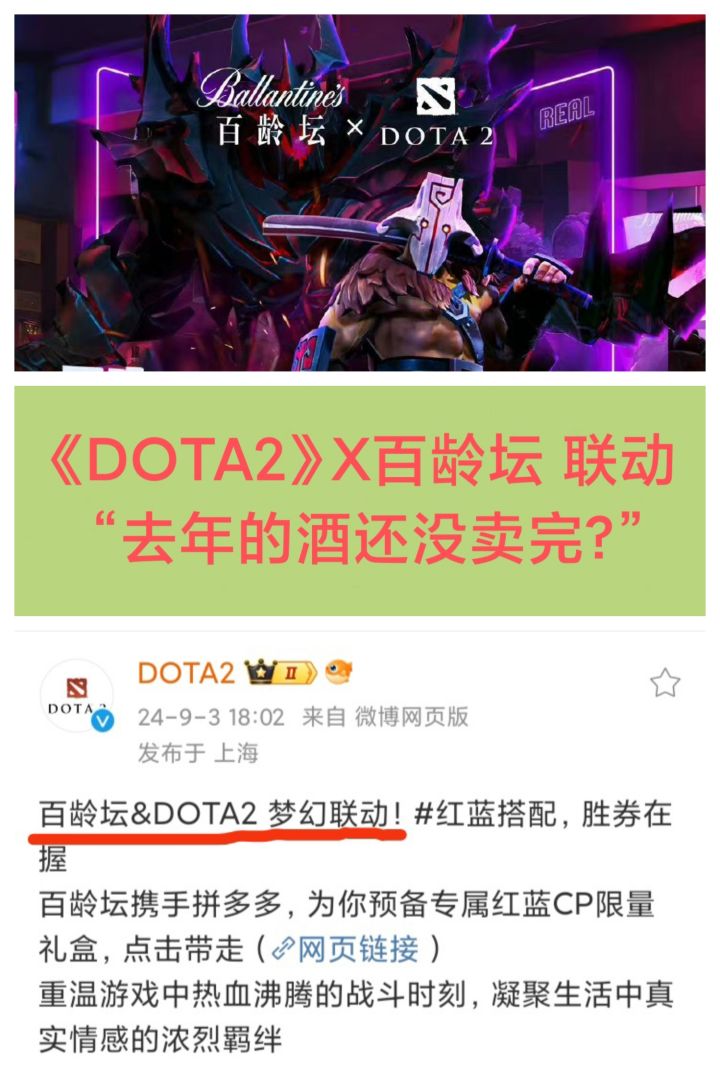 9/3号下午,DOTA2官方宣布,与百龄坛开启梦幻联动❗❗❗不过,这个联动,被玩家戏称为“最失败的联动”今年3月,DOTA2联动百龄坛;去年10月,DOTA2还是联动百龄坛“去年的还没卖完么” “陈年老酒”“去年的库存,没意思”今年的TI13不能再游戏内显示赞助或广告信息了,还是依旧有不少商家给赞