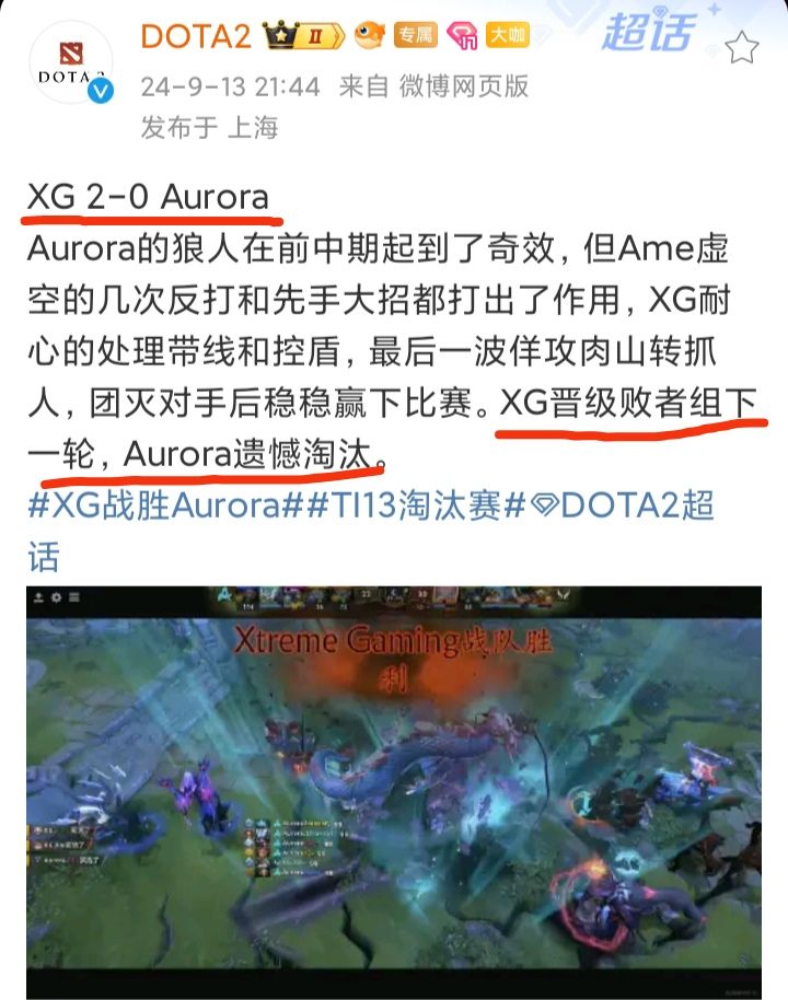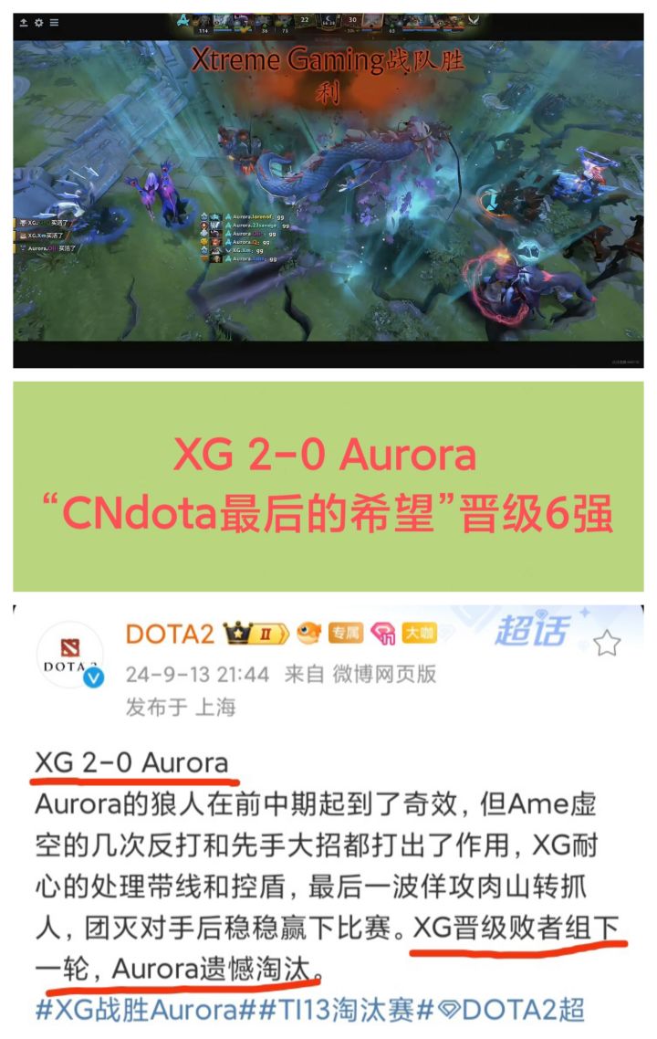 9/13号晚,DOTA2官博发文宣布,XG以2-0比分轻取对手,顺利晋级TI 13决赛六强❗❗❗XG作为CNdota的最后的希望,可毕竟是落入败者组,输一次就GG的那种!感觉这一次可以保六争三了今年CNdota成绩不太行,老牌强队LGD已经被教透露出要解散的意思了只希望XG能走的更远吧,CNdota 加油!#今天游戏圈发生了啥 #游戏资讯 #资讯评论员 #T