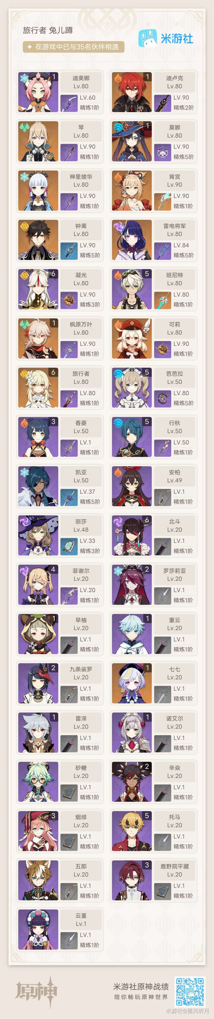 目前还缺的五星角色:白术,艾尔海森,申鹤,草神,魈。想抽还在犹豫抽不抽的角色:公子,狐狸。待练的角色:申鹤,菲谢尔,砂糖,行秋,诺艾尔,五郎,云堇,坎蒂丝。考虑练但是目前并不打算投入资源的角色:安柏,丽莎,凯亚,北斗,七七,香菱,雷泽,小鹿,烟绯,重云。还在观察的角色:莱伊拉,九条,公子,狐狸,早柚,芭芭拉,辛焱,托马。正在训练的角色:柯莱,甘雨,温迪,草神,刻晴。已经毕业的角色:心海