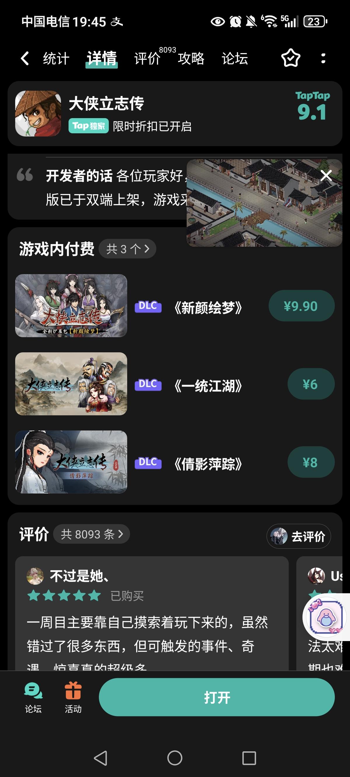 没错,最近有点游戏玩不过来,但是最近tap有折扣活动诶我怎么可能错过呢,心怡了好几款游戏,比如说古镜记,悬疑感满满,但听说很难就又看了下鬼谷八荒,感觉和上古河图画风很像啊!因为是修仙类犹豫了一下,后来又看了一下陶艺大师,这个应该比较简单上手很适合我,而后又看了一下艾希,我想我应该会手残吧,然后部落与弯刀第一眼我很感兴趣,图标充满异域风情,最后还是选了大侠立志传,毕竟不能买太多,个人很容易放弃又没耐