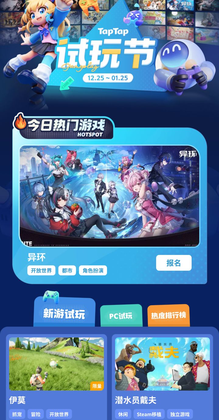 TapTap试玩节于2025年12月25日启动,持续至2026年1月25日,为期整整一个月。本次活动免费开放上百款高质量游戏试玩,覆盖手游与PC平台,包括多款首次测试的作品。规模远超往届,PC端专设国产单机游戏会场,提供《星之旅Lunarium》等Steam好评移植作[活动页]。试玩节精准对接寒假档期,旨在满足玩家多样化娱乐需求,打造一站式新游体验盛宴。重点游戏亮点突出:《潜水员戴夫》开启首次移