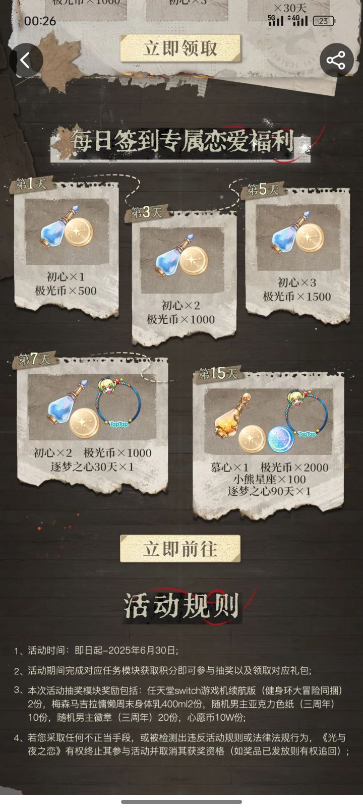 点击立即前往是之前夏鸣星的签到,这也不对劲啊#光与夜之恋 #TapTap签到