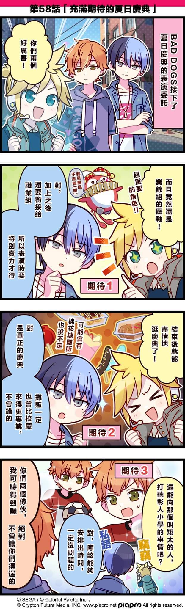 【「世界」劇場 四格漫畫】 尊敬的各位居民: 今日是關於[Vivid BAD SQUAD]的小故事~ 第58話「充滿期待的夏日慶典」 #pjsk#世界计划#VBS