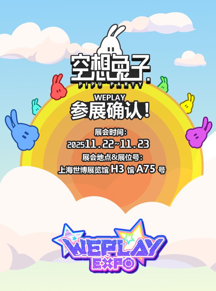我们将携《空想兔子 PiPuParty》亮相 WePlay,欢迎来现场一起玩!#发现好游戏 #游戏杂谈 #单机游戏 #steam游戏 #weplay 游戏:1–8 人本地多人派对平台解谜。共用一个「三格符号背包」,把「符号」放到方块上即可让平台翻/移/转;救队友,或“整点活”。版本:当前为「仅本地多人」的playtest版本,推荐 2–4 人同屏。时间地点:11.22-11.23 · 上海