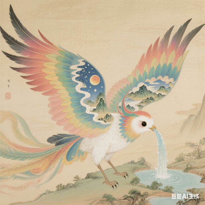 #修仙时代 #ai修仙时代 #小蛙生图创作 绘制一个修仙灵宠形象。可参考《山海经》,形如英招,却长着五彩斑斓的羽翼,羽翼展开时遮天蔽日,羽毛上绘有山川河流、日月星辰的图案。它能口吐清泉,清泉所到之处,万物复苏,是修仙者滋养灵植、恢复灵力的好帮手。