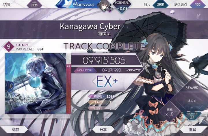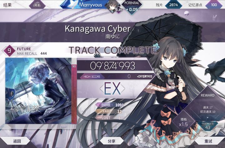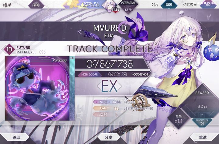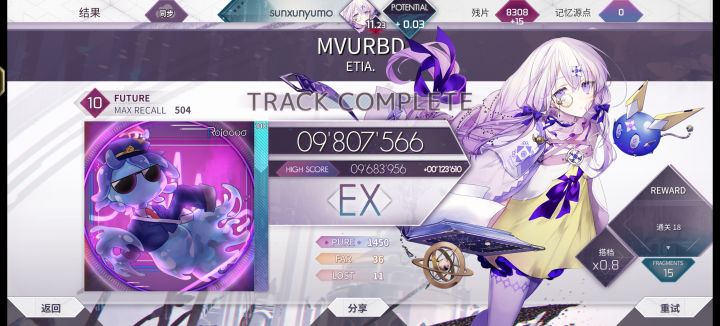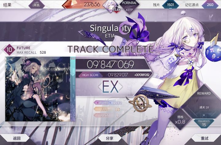 Ego Eimi这么神!昨天听一个佬推荐了这首,就试了下,锁屏练了2pc就开始推,然后再打3pc直接将近EX+!(虽然是因为最后的短蛇没有接上痛失EX+)很少遇到手感这么好的谱了#arcaea #arcaea准度 #arcaea萌新
