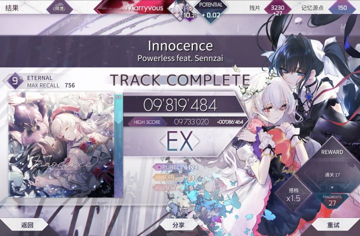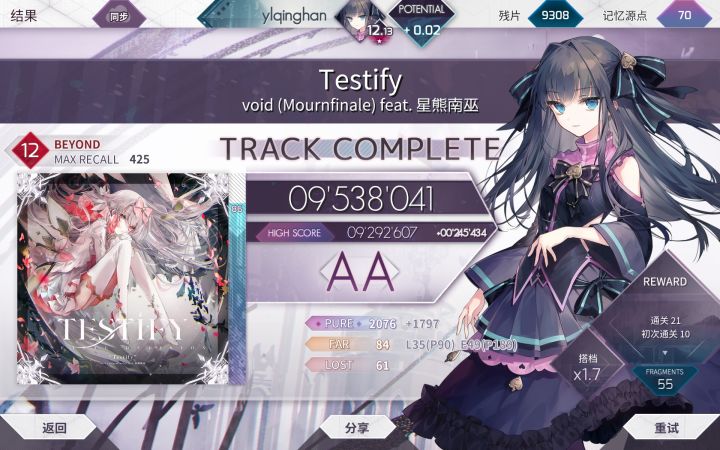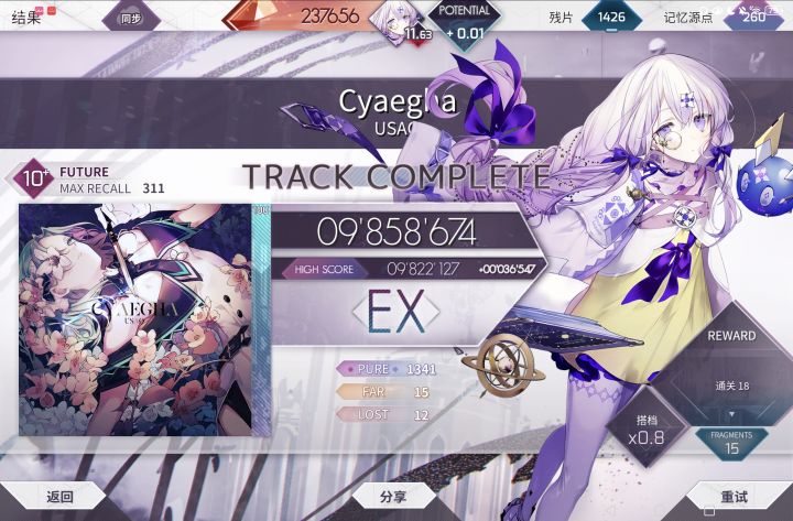 今天和昨天总共打了将近3h,终于把三角交互的肌肉记忆建立了一点,推了大概半个小时就上EX了,这也是我的第六首单曲摘星(红AE并非我打的,但是压线了我不管)#arcaea #arcaea准度 #arcaea萌新