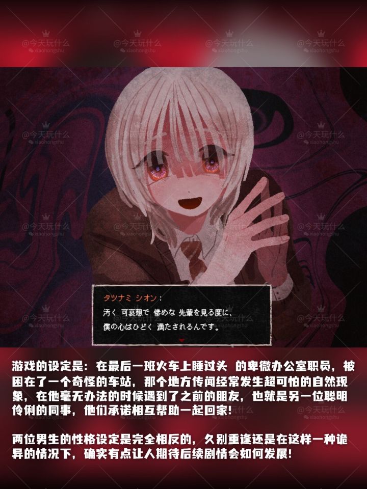 🚉终焉车站🚏pc🚧剧情/恋爱模拟/视觉小说/ADV/恐怖 思考“我在最后一班火车上睡过头了,最后到达了一个叫做‘Saihate站’的奇怪的地方__”「春夏冬ハル」和「立浪シオン」是两位在同一家公司工作的男生,只不过性格完全相反,「立浪」开朗优秀,而「春夏冬」却是那种自卑、缺乏自信的性格,原本两个人不该有交集的,但偶然在车站的相遇让故事变得更加戏剧性了。启动剧情设定是两个男生之间的情感羁绊