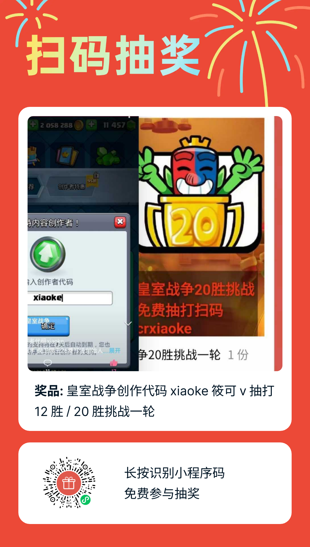 皇室战争创作代码xiaoke筱可免费抽打12胜/20胜挑战一轮 #皇室战争 #clashroyale #supercell #2025 #crl #lol #pubg #英雄联盟 #云顶之弈 #原神 #吃鸡 #电竞 #抽奖 #免费 #部落冲突 #荒野乱斗 #20胜 #微信 #扫码 #游戏#CRL#LOL#PUBG#CRL#LOL#PUBG