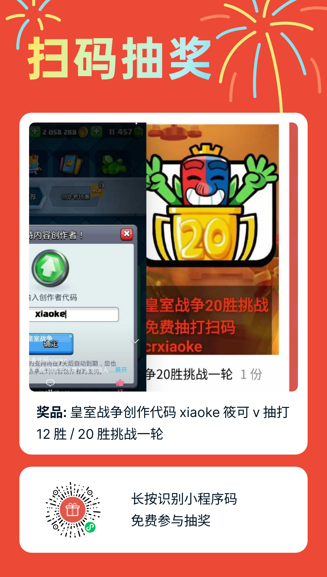 皇室战争20胜挑战免费抽马服创作代码xiaoke