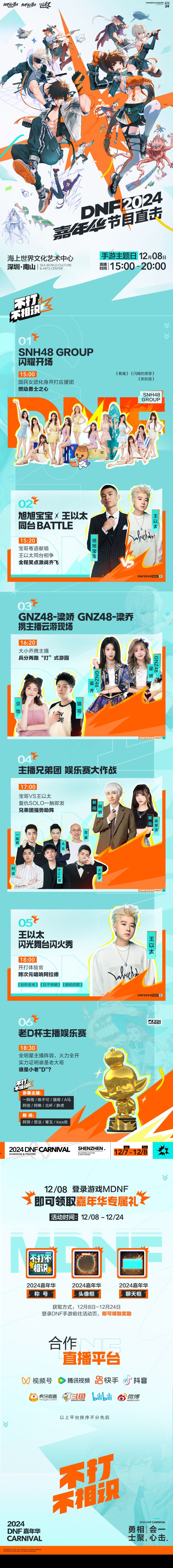 【全开放,免门票!】2024DNF嘉年华活动马上开启!来快乐老家一起重聚!期待[表情_期待] 勇士们,赛丽亚一直在你熟悉的地方,回溯时光共同开启那一段青春回忆!开心[表情_开心] 看过这些即将亮相的舞台,勇士们最期待哪一个呢?欢迎在评论区留言分享~送花[表情_送花] 小老D在浪漫飘雪的深圳,等着大家哦!送花[表情_送花] 🕑线上直播地址:全平台 📍线上直播时间:12月8日 15:00-20:00 🎉