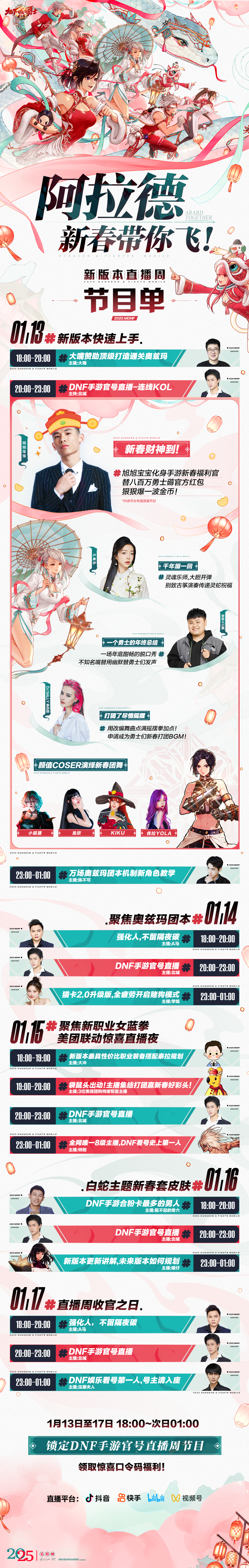 1月13日至1月17日,18点至次日1点,阿拉德直播间新春祝福大放送,旭旭宝宝和各位主播达人前来送福,轮番上阵,带勇士们快速上手新版本送花