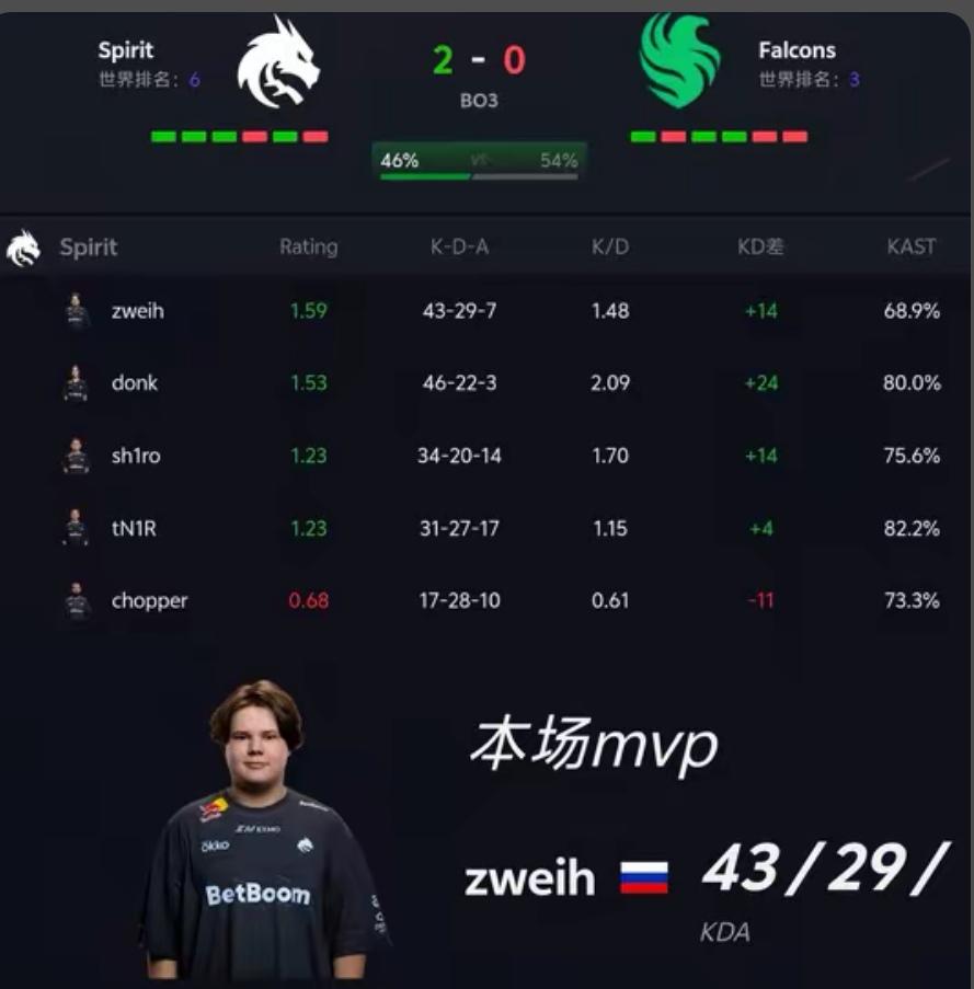绿龙成功击败Falcons拿下胜利,本场焦点当属选手zweih的爆发表现。此前比赛中,zweih状态低迷,发挥不尽如人意,一度让人感到陌生。但来到majon赛场,如果donk是齐天大圣,那zweih就是天蓬元帅,两场比赛均斩获5杀ace,凭借无解发挥带领队伍取胜,最终成功拿下本场MVP,更让zweih用实力打破质疑,证明了自己。Falcons本场比赛表现堪称灾难级,全程节奏混乱,未能打出应有水准