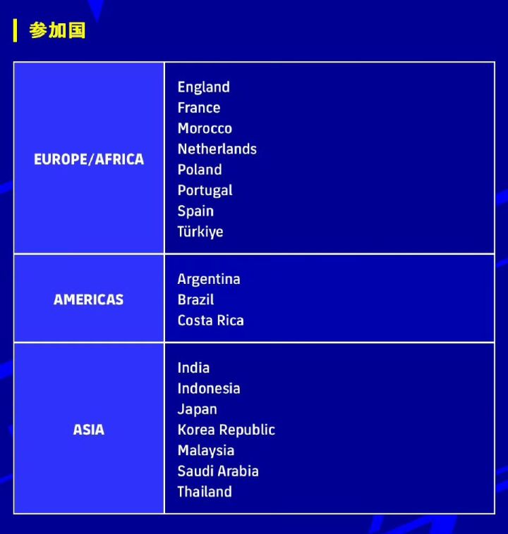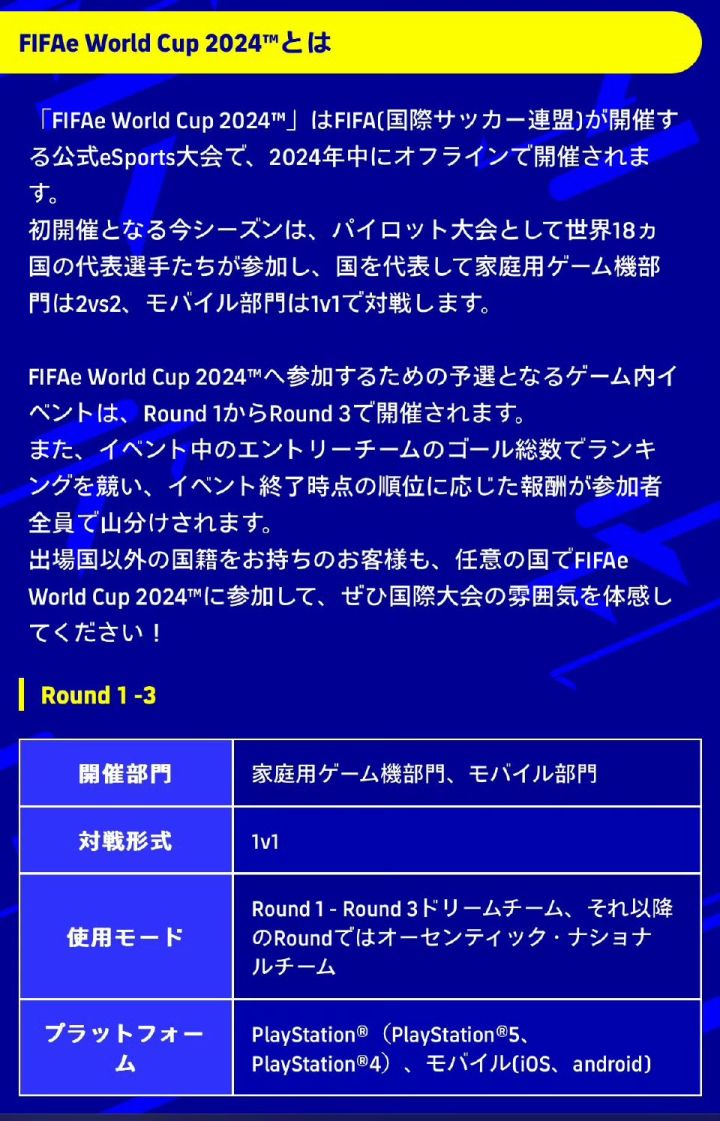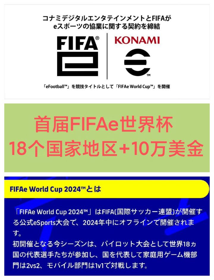 10/10号,科乐美宣布与国际足联(FIFA)签署合作协议,将于2024年内举办以《eFootball》为竞技项目的首届“FIFAe世界杯”❗❗❗2024年内,将分别举行移动端和PC/主机平台的两场“FIFAe世界杯”,预选赛已于今天正式启动。根据之前公布的信息,本次奖金有10万美金本次参赛的国家和地区包括阿根廷、巴西等18个国家和地区,就是不包含中国