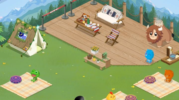 只要把新地板壁纸放上就知道这套家具适合干什么了,跟户外沾点关系的应该都能试着搭一下。先把联动家具都放上:放上椰子树更有户外的感觉,野餐垫不坐人看着不得劲,所以放上了表演者坐垫,火山野牛和花架假楼梯纯属个人兴趣:将主题同为露营的夏令营家具加上,微调小动物的位置(到这里已经可以了):最后的树桩和花丛既丰富了要素也让人觉得拥挤,要不要继续加东西看自己的兴趣。附上有人物的全景(既然是联动家具为主