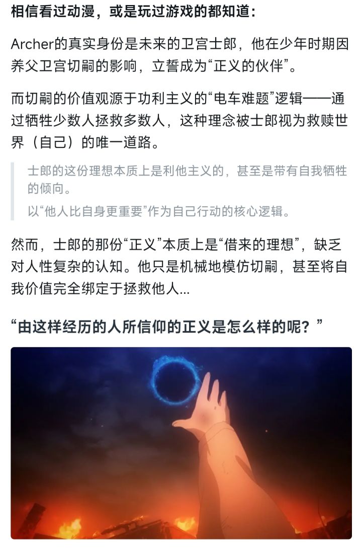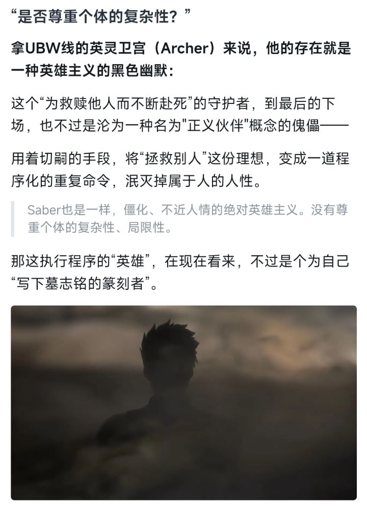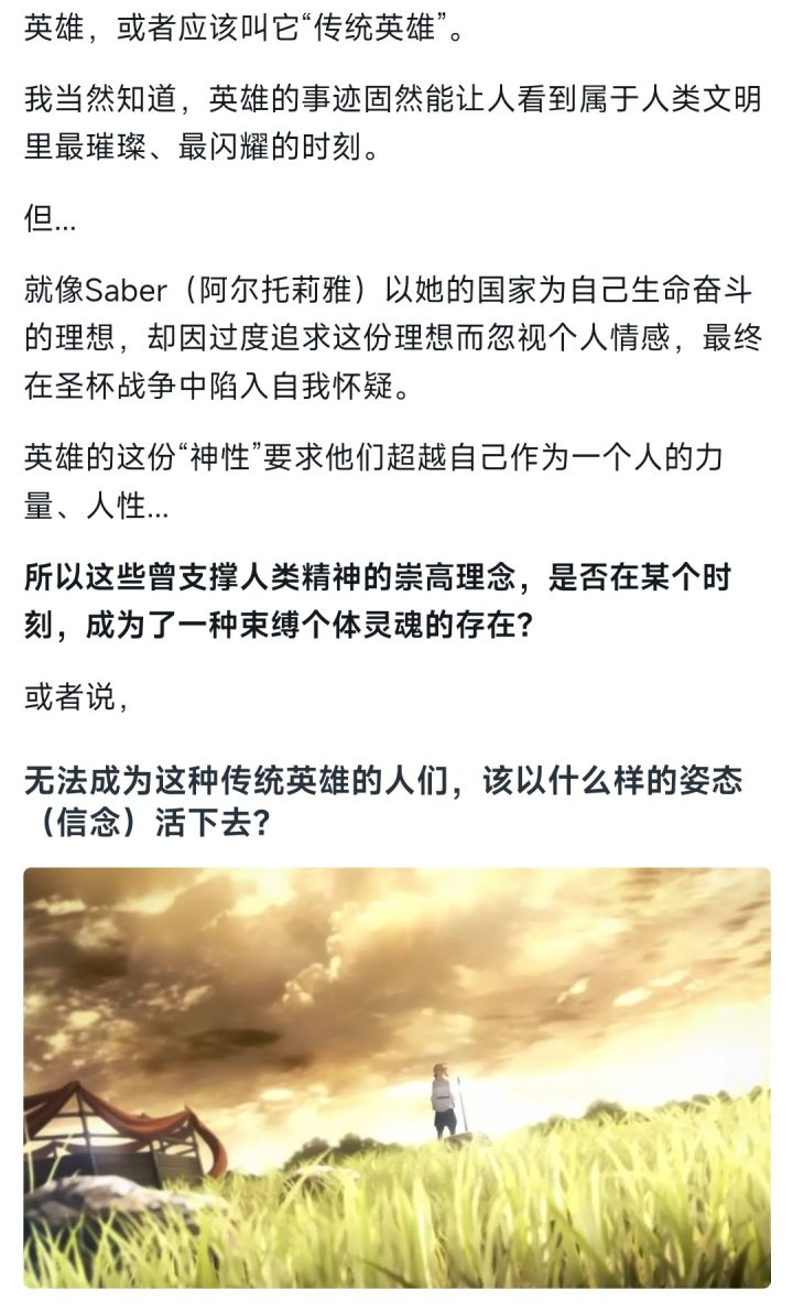 在我个人玩过的Galgame里,作品通常是以女主的“上限”来决定自己的上限。不过在《命运之夜》这部作品里,显然不一样。尤其是男主在HF线的表现,将这部作品拉高到一个令人难以望其项背的位置。那今天,就跟各位聊聊为什么卫宫士郎能在HF线将作品拉高到“神作”的位置。少年士郎在冬木市的废墟中被卫宫切嗣所拯救,他仰视这个男人的侧脸。誓要将那拯救者的姿态如“神谕”般烙印于自己的灵魂深处。于是“正义的伙伴”