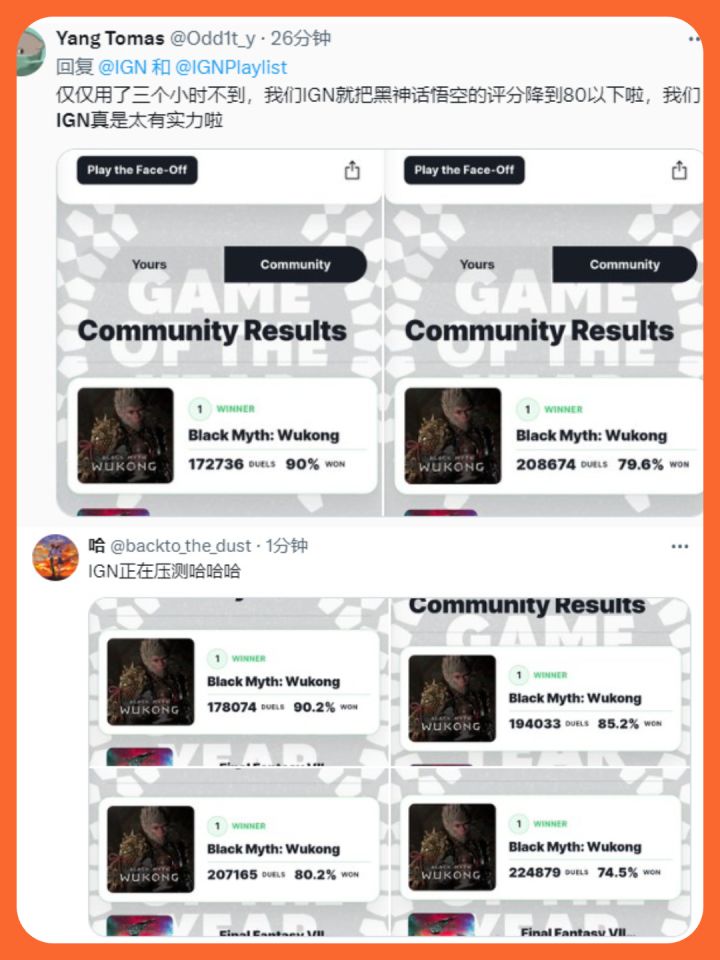 日前,在IGN年度最佳投票上,《黑神话》支持率骤降引起广泛关注。在晚些时候,IGN官方也在推特上作出回应:我们没作弊! 国外网友表示,“就不该相信这是一场该死的民意调查,IGN正在做假……”IGN在回复中说道:“我们会调查一下投票(在过去12个小时里有大量的《宇宙机器人》vs《黑神话:悟空》的投票pk),但没有投票被我们删除或者修改。这场pk还在进行中,将持续数月。” 目前,《黑神话》在IGN年
