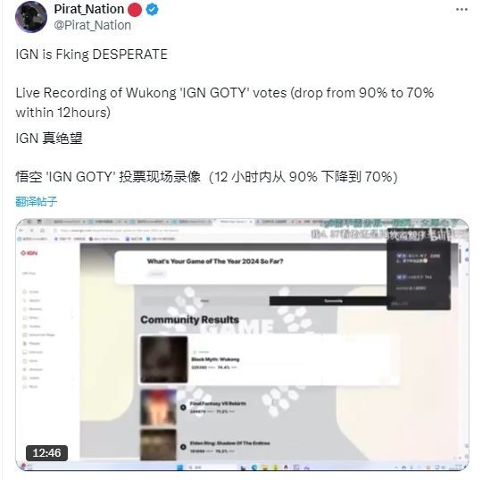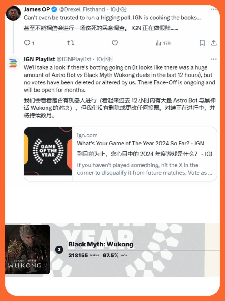 9/25号,IGN联合创始人Peer Schneider对最近《黑神话悟空》在IGN“年度游戏”投票中的争议进行了回应❗❗❗他表示,《黑神话》投票排名的变化是因为“排除了机器人的影响”,IGN没有操作投票结果目前,《黑神话》在投票页面的得票率为68.7%,总票数333547票,位列第三名一开始是90%得票率,随后就连续下跌+关闭投票