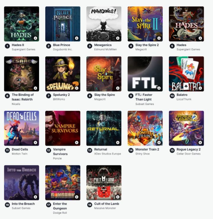 随着《杀戮尖塔2》全网爆火,肉鸽品类再度成为玩家焦点。知名游戏媒体IGN近日在社交平台 X 上,正式公布了最新评选出的18 款最佳肉鸽游戏榜单,瞬间引发玩家热烈讨论。上榜游戏分别是:1.《哈迪斯2》2.《蓝途王子》3.《喵喵的结合》4.《杀戮尖塔2》5.《哈迪斯》6.《以撒的结合:重生》7.《洞穴探险2》8.《杀戮尖塔》9.《超越光速》10.《小丑牌》11.《死亡细胞》1