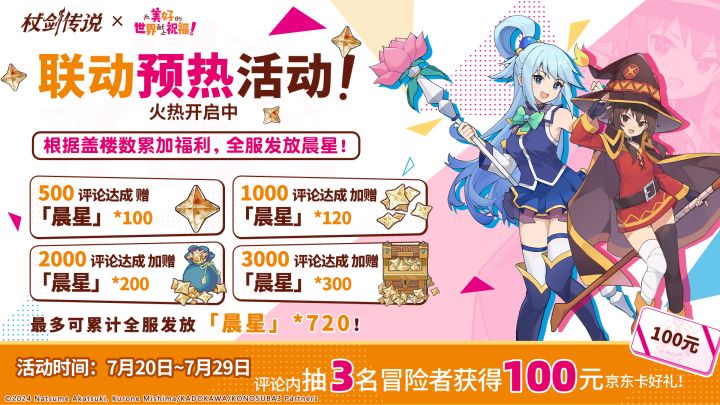 《杖剑》×《为美好世界献上祝福!》联动开启中!为了纪念本次联动开启,给冒险者们准备了丰厚奖励!共计给10名冒险者送上100元京东卡!10名冒险者送上50元京东卡!10名冒险者送上「晨星」*1000!✦-----------------✦ 活动时间:■8月1日 23:59 为止参与方法:①关注杖剑传说官方账号②评论本条帖文✦-----------------✦ ▼立即下载✦