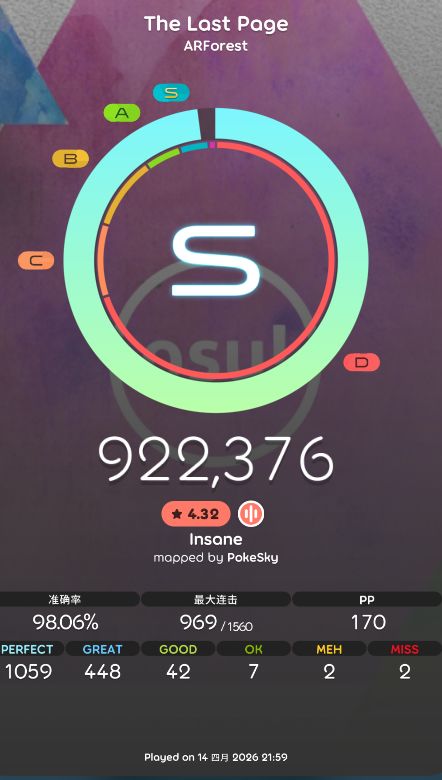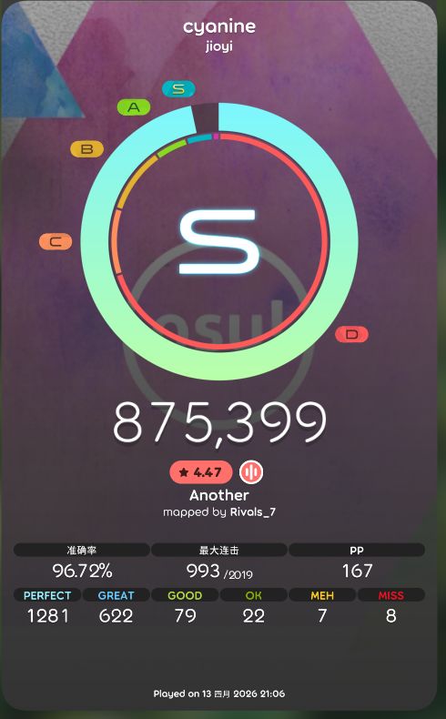现在上高中了,两星期中12天上学,2天回家,回家如果臀更新的话玩玩,现在初见非常的废,不更新的话直奔电脑而去去玩om,是真的有点上瘾了(//∇//)等过年的话,推推臀吧,是真的退了很多,最后一句话你的双手是为了你一生而服务,而不是为了音游(注意休息#phigros#Phigros萌新#osumania#音游#4k