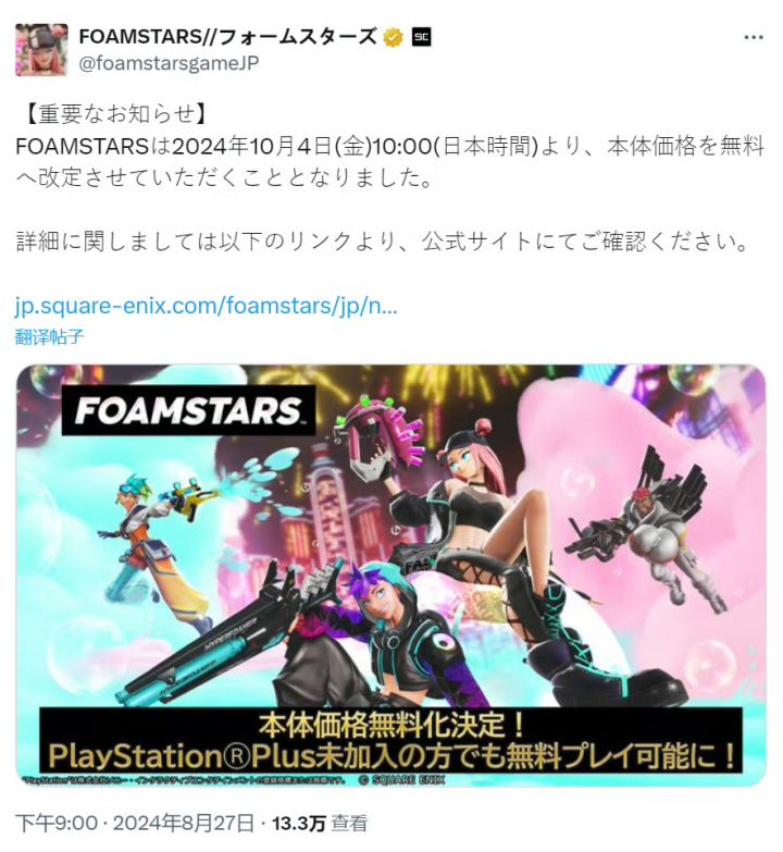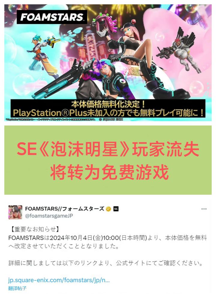 8/27号晚,Square Enix官方宣布,《泡沫明星(FOAMSTARS)》10月将转为免费游戏❗❗❗据悉,《泡沫明星》于今年2月在Playstation平台独占推出!而根据TrueTrophies 的统计数据参考,游戏在推出两个月后就流失了95%的玩家转为免费游戏,是SE的一次尝试,至于否能够挽回老玩家或者吸引白嫖玩家,只能看天意了