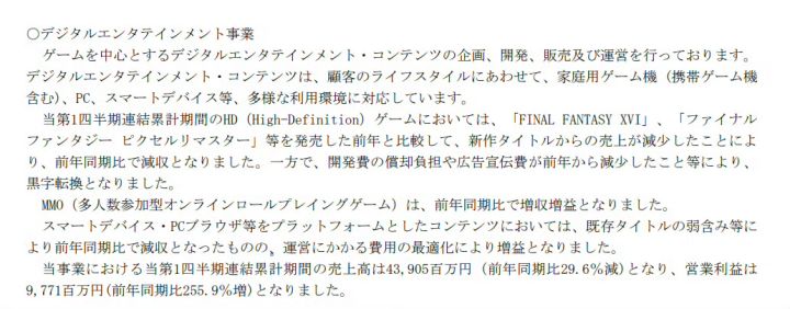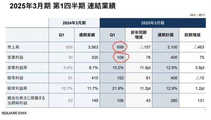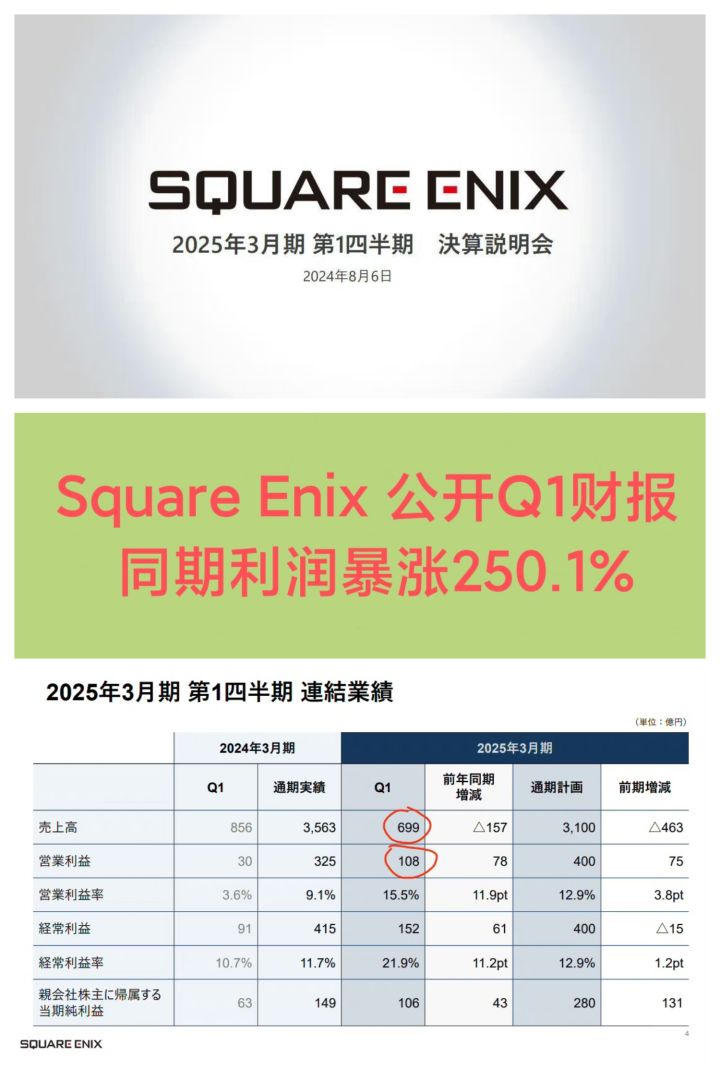 8/6号,Square Enix公开了2024-2025财年Q1季度的财报,营业利润较去年暴涨250.1%❗❗❗截止2024年6月30日,Q1销售额为699.15亿日元,相比去年同期下降18.4%但,营业利润达到了108.44亿日元,比去年同期暴涨了250.1%SE在官方财报文件中说明,在开发成本的摊销