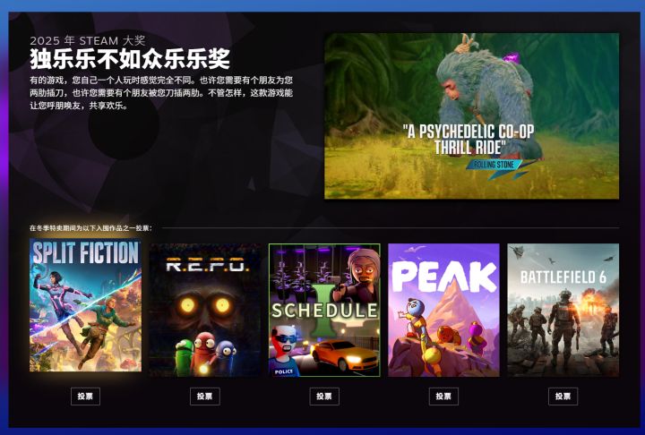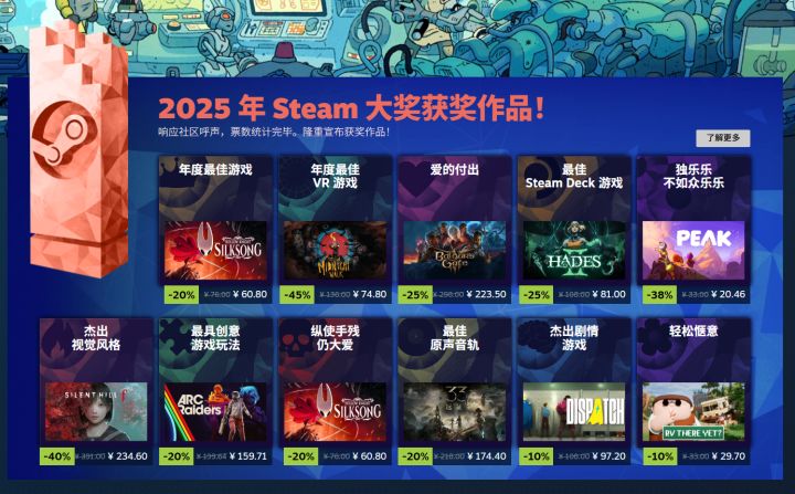 2025年Steam大奖获奖名单出炉:年度最佳游戏:《空洞骑士:丝之歌》年度最佳VR游戏:《午夜漫步》爱的付出:《博德之门3》最佳Steam Deck游戏:《黑帝斯2》独乐乐不如众乐乐:《PEAK》杰出视觉风格:《寂静岭f》最具创意游戏玩法:《ARC Raiders》纵使手残仍大爱:《空洞骑士:丝之歌》最佳原声音轨:《光与影:33号远征队》杰出剧情:《超英派遣中心》轻松惬意: