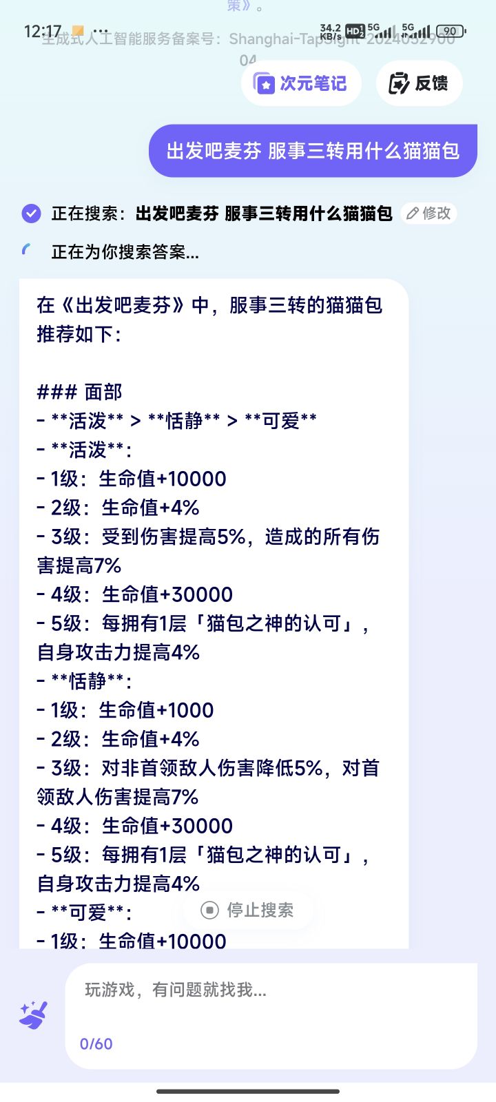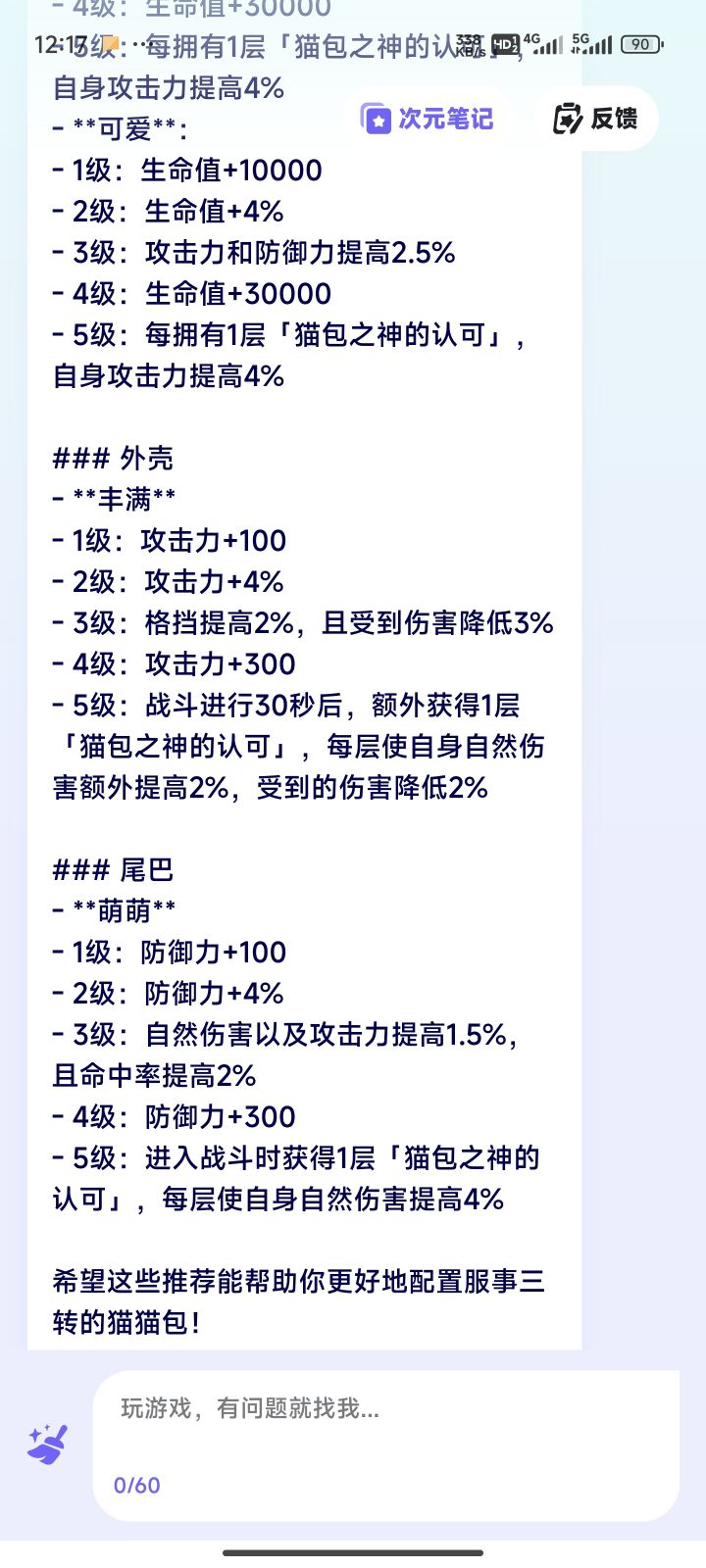 在《出发吧麦芬》中,服事三转的猫猫包推荐如下:### 面部- **活泼** > **恬静** > **可爱**- **活泼**:- 1级:生命值+10000- 2级:生命值+4%- 3级:受到伤害提高5%,造成的所有伤害提高7%- 4级:生命值+30000- 5级:每拥有1层「猫包之神的认可」,自身攻击力提高4%- **恬静**:- 1级:生命值+1000- 2级:生命值+4