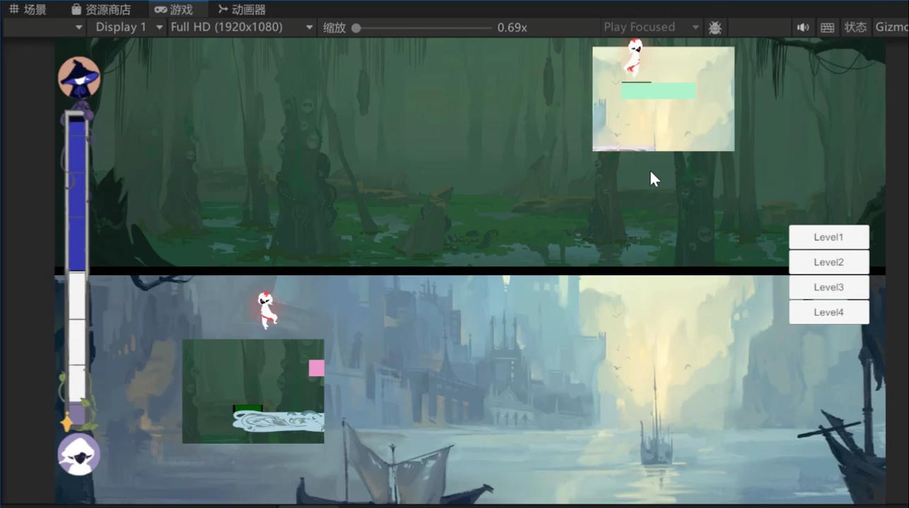 给大家看看其中一个关卡的实况哦!部分美术素材还没有替换 出了实机以后我突然觉得好像跳跃高度太高了,遂让程序改之,因为觉得跳跃高度太高画面又因为上下分屏比较扁,就会显得观感不好。调整好的还没有来得及录制。 接下来我们就是将开场动画和关卡主体整合,以及过场的衔接了,过场的话由于美术压力过大放弃了画插画的想法,决定直接黑屏加文字! 还有的话就是封面,封面美术正在画了!还有图标好像也要提交以及logo。。